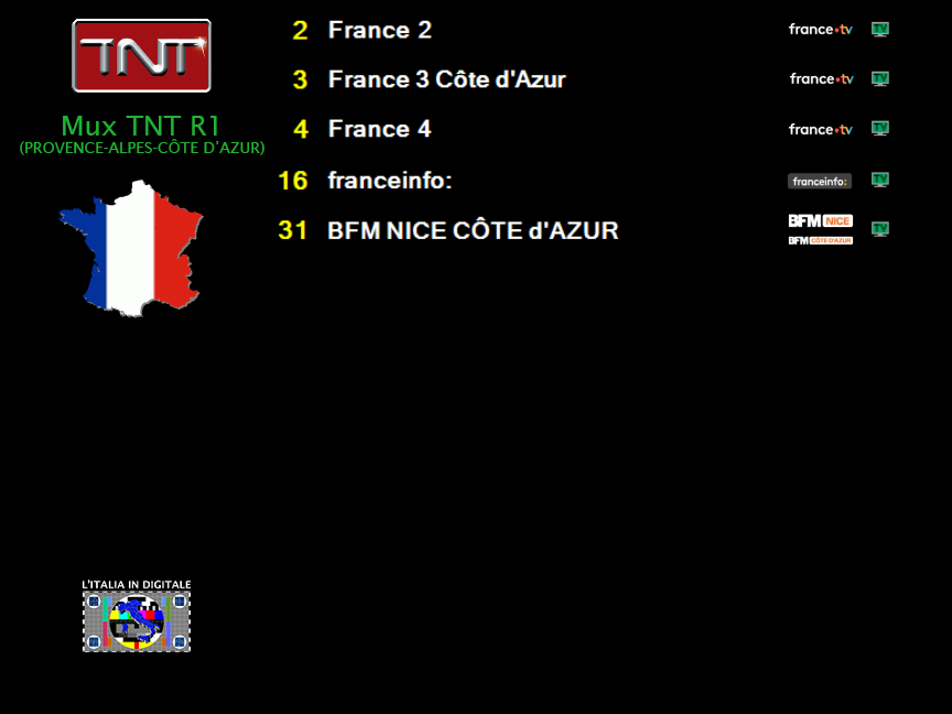 Infine il Mux TNT R1 (PROVENCE-ALPES-CÔTE D’AZUR) copre un’ampia area della regione