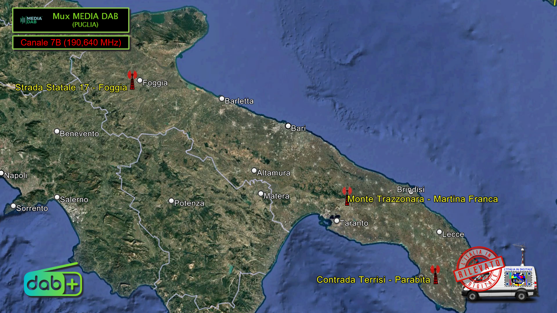 Attualmente il Mux MEDIA DAB (PUGLIA) trasmette sul blocco 7B dalle seguenti postazioni.