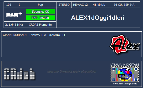 nel Mux CR DAB (PIEMONTE) identificata ALEX1dOggi1dIeri, ed in streaming all’indirizzo web www.radioalex.it.