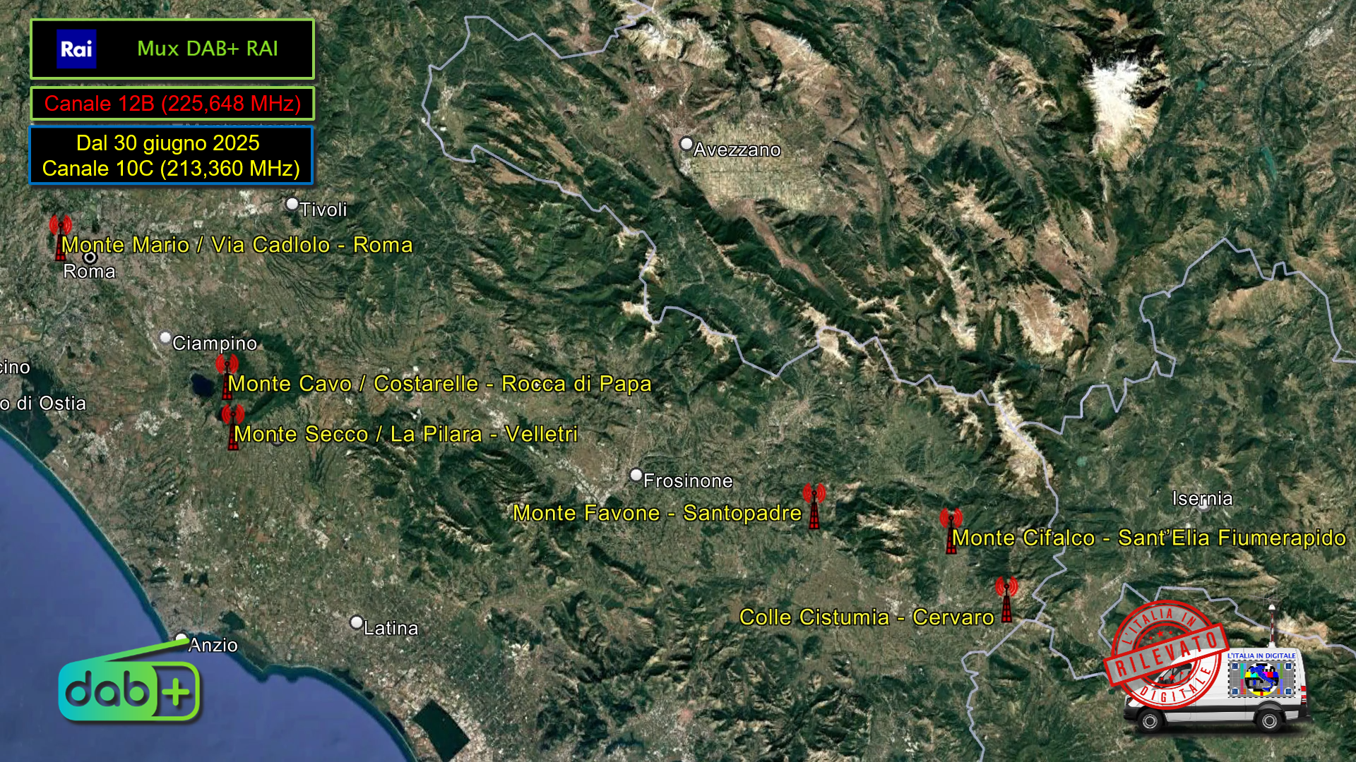 Attualmente il Mux DAB+ RAI è attivo sul blocco 12B dalle seguenti postazioni laziali.
