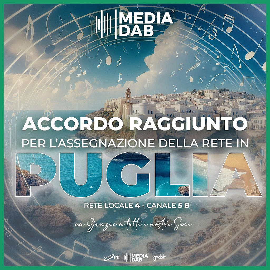 Anche in Puglia è stata assegnata la frequenza definitiva alla versione locale del consorzio radiofonico MEDIA DAB.