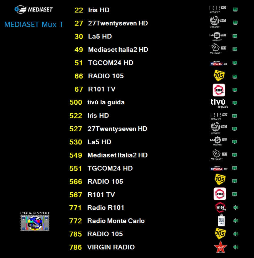 Nel MEDIASET Mux 1 i canali dati eliminati sono nove.