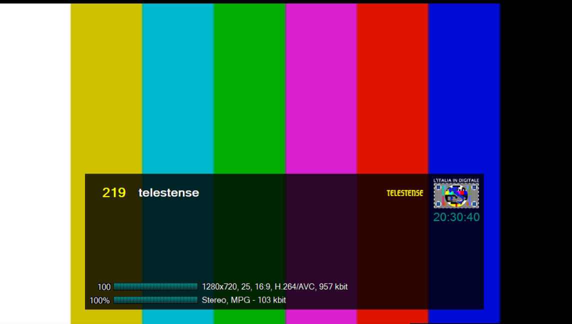 Sul teleschermo compaiono le barre colore in alta definizione con la risoluzione video 1280×720 e la programmazione risulta sospesa.