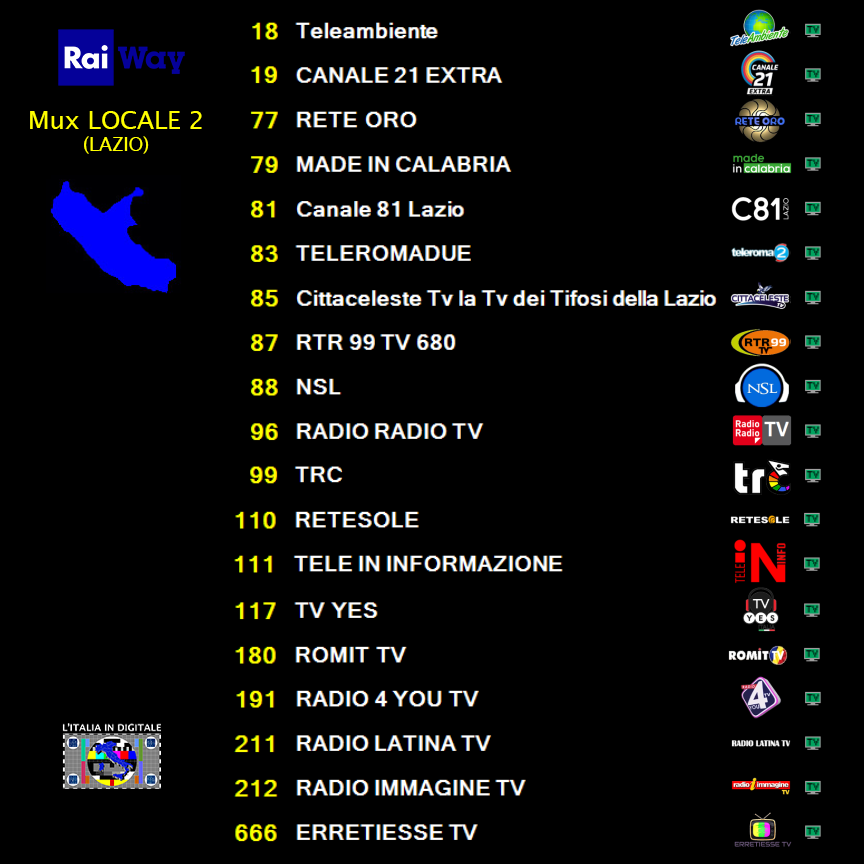MUX LOCALE 2 (LAZIO): INSERITE TRC DI CIVITAVECCHIA E TELE IN INFORMAZIONE, CAMBIO DI LCN PER CANALE 21 EXTRA, NUOVO LOGO PER RETE ORO.