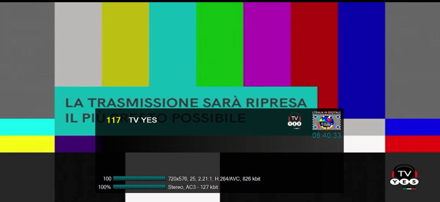 TV YES (LCN 117) trasmette sempre con la insolita risoluzione 2.21:1; durante questa rilevazione era presente il seguente cartello.