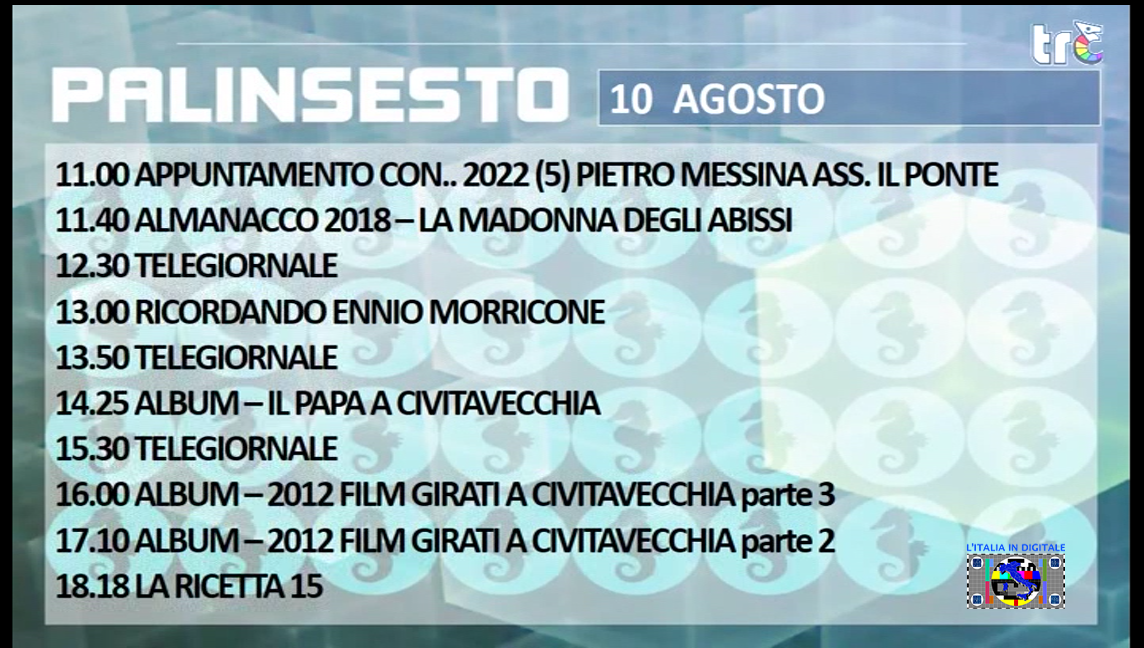 In riferimento al nostro ultimo monitoraggio del 2 Luglio, segnaliamo nel pacchetto l’aggiunta di TRC (LCN 99) acronimo di Tele Radio Civitavecchia.