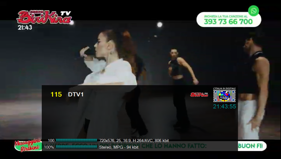 La musicale Radio Birikina TV di Castelfranco Veneto (TV), veicolata sulla LCN 115 ed in MPEG-4 H.264 ed in definizione standard,
