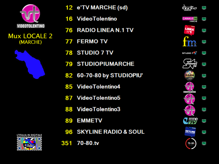 Sulla posizione automatica 16 l’emittente VideoTolentino trasmette sempre con il logo di CANALE 16 MARCHE in basso a destra.