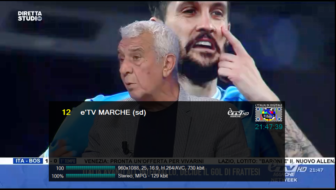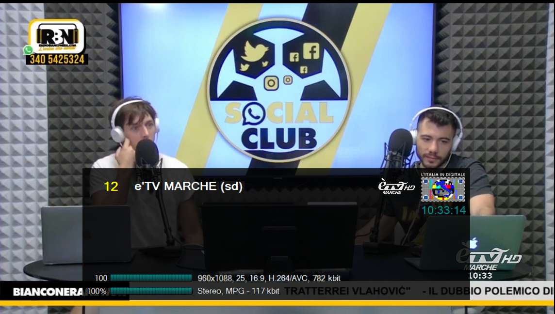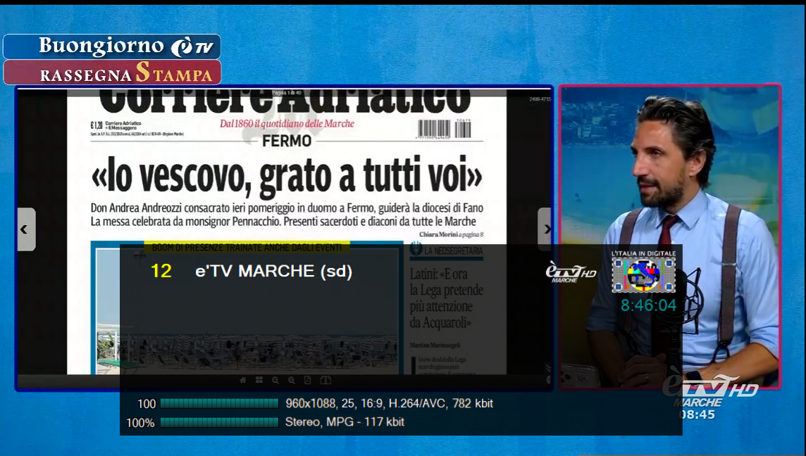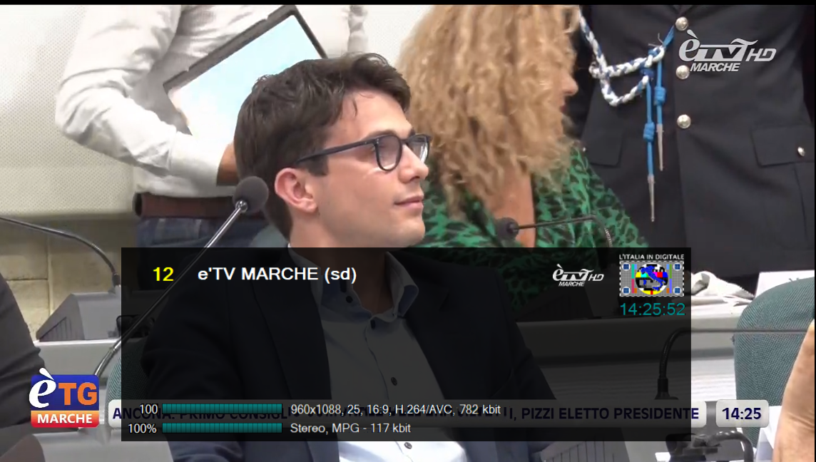 Al tasto 12 del telecomando è visibile èTV MARCHE HD, in alta definizione con la risoluzione 960×1088,