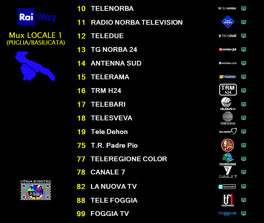 veicolata anch’essa in MPEG-4 H.264, nel Mux LOCALE 1 (PUGLIA/BASILICATA), sulla LCN 13.