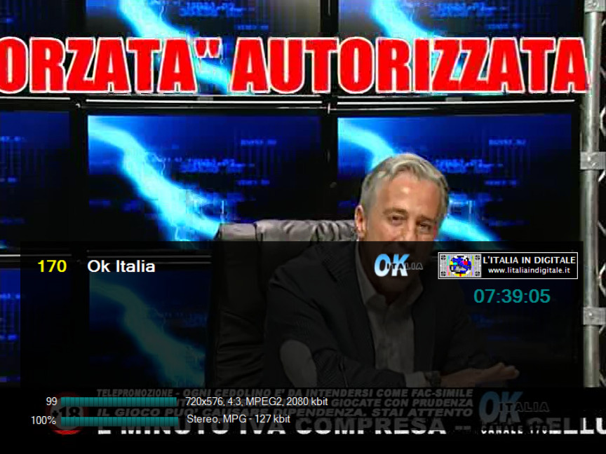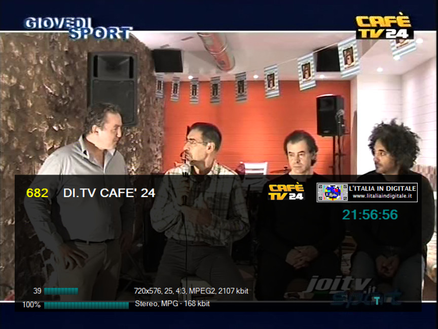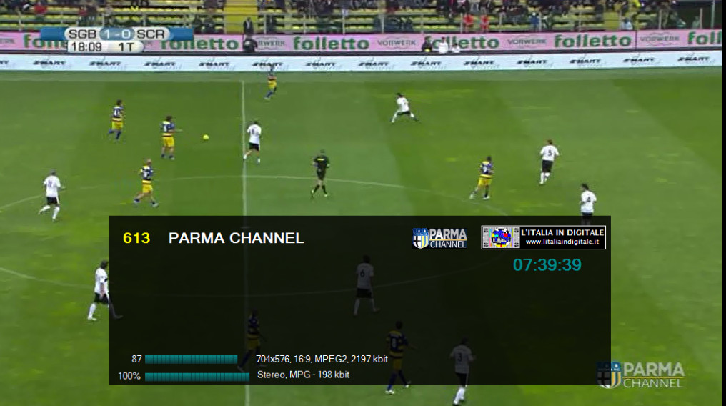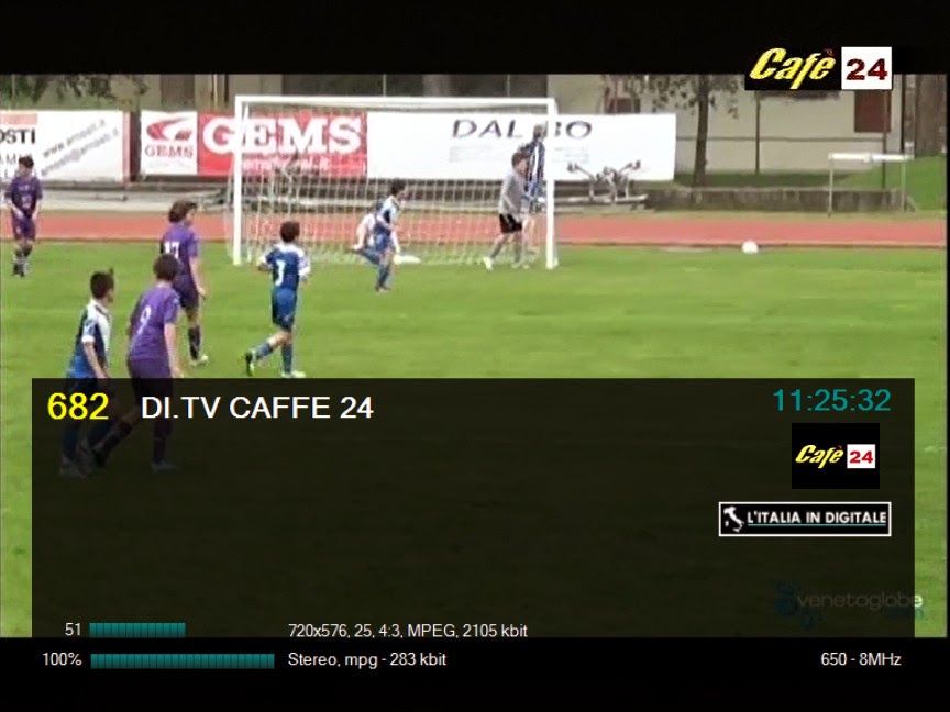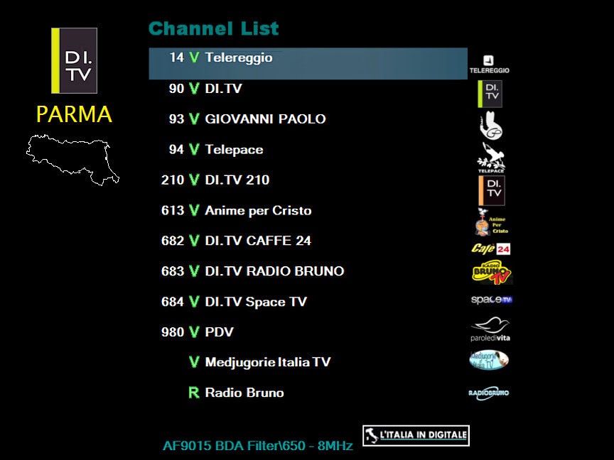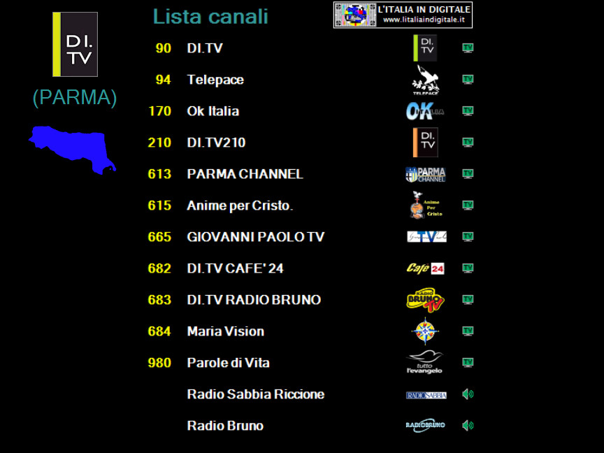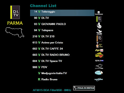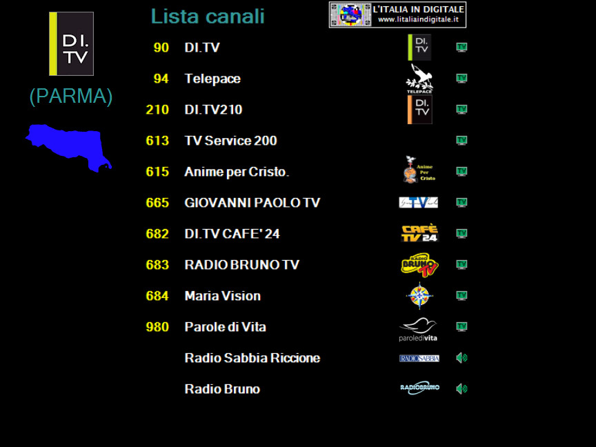UHF 43 Mux DI.TV (PARMA) Rispetto alla nostra precedente rilevazione del 28 luglio scorso segnaliamo che è stata eliminata Ok Italia che si posizionava sulla LCN 170. PARMA CHANNEL (LCN 613), l'emittente sportiva dell'omonima squadra del massimo campionato, non è più presente in questo mux e lo slot è senza nominativo, il nostro ricevitore lo sintonizza come TV Service 200. Regolarmente in onda la programmazione di GIOVANNI PAOLO TV sulla LCN 665 (lo scorso luglio mentre effettuavamo la rilevazione questo canale era a schermo nero). DI.TV CAFE' 24 (LCN 682) invece ha adottato un nuovo logo di stazione che vi mostriamo nella gallery di immagini di questa news. Cambia l'identificato di DI.TV RADIO BRUNO (LCN 683), ora il canale è denominato RADIO BRUNO TV. Abbiamo aggiornato la griglia dei canali e lo z@pping TV del mux DI.TV (PARMA). ![]() ![]() ![]() ![]()