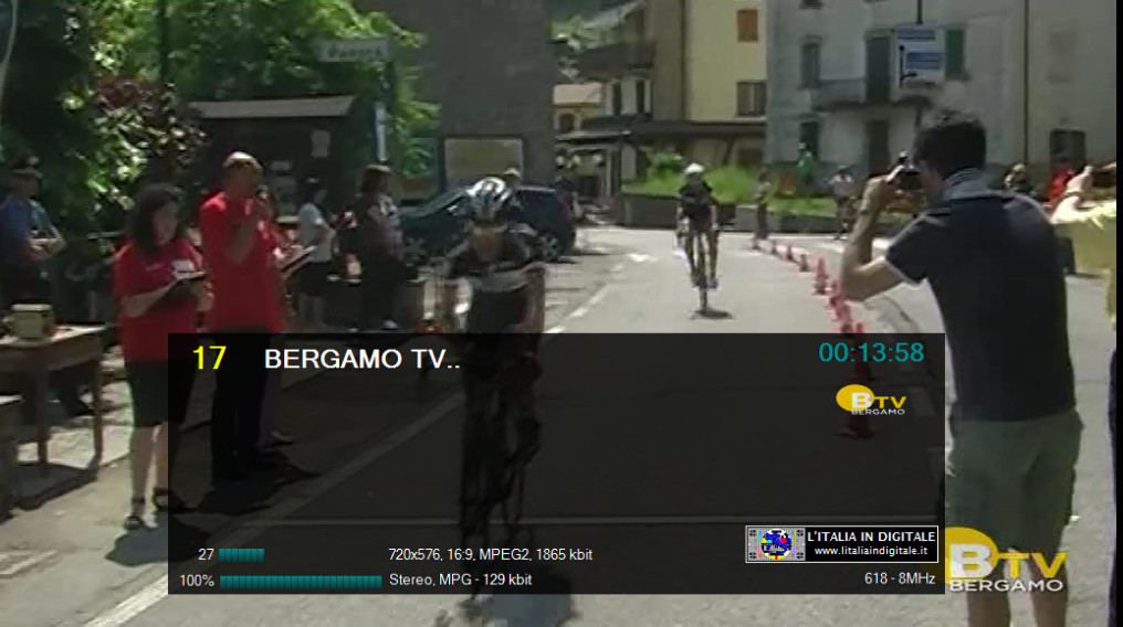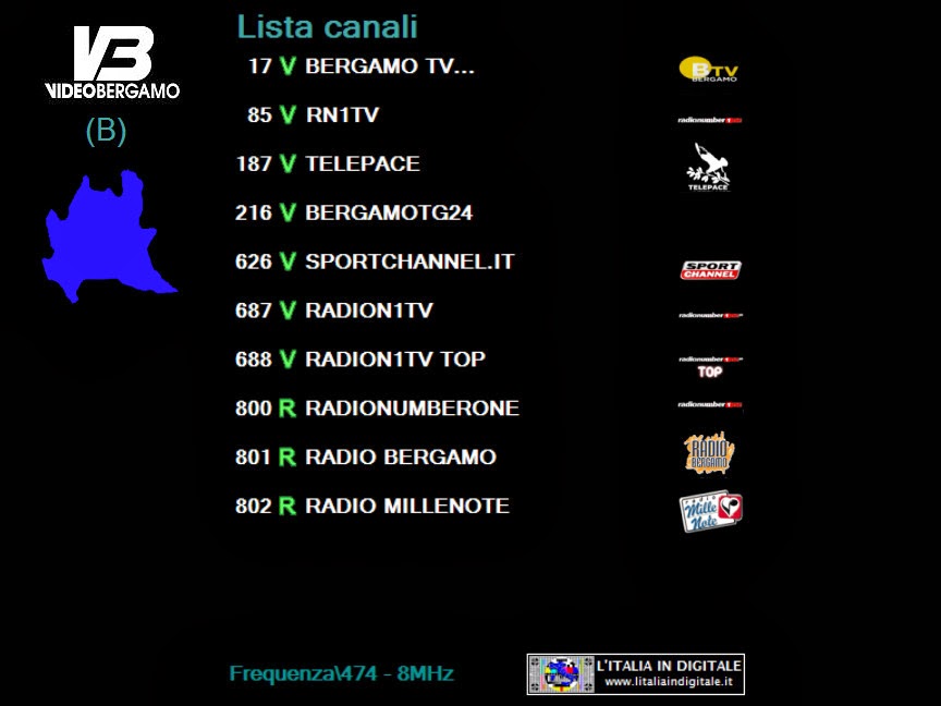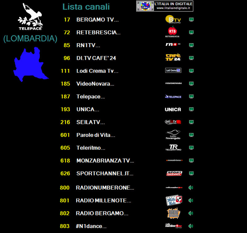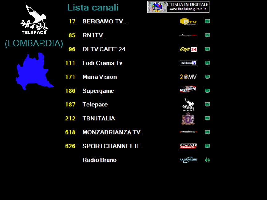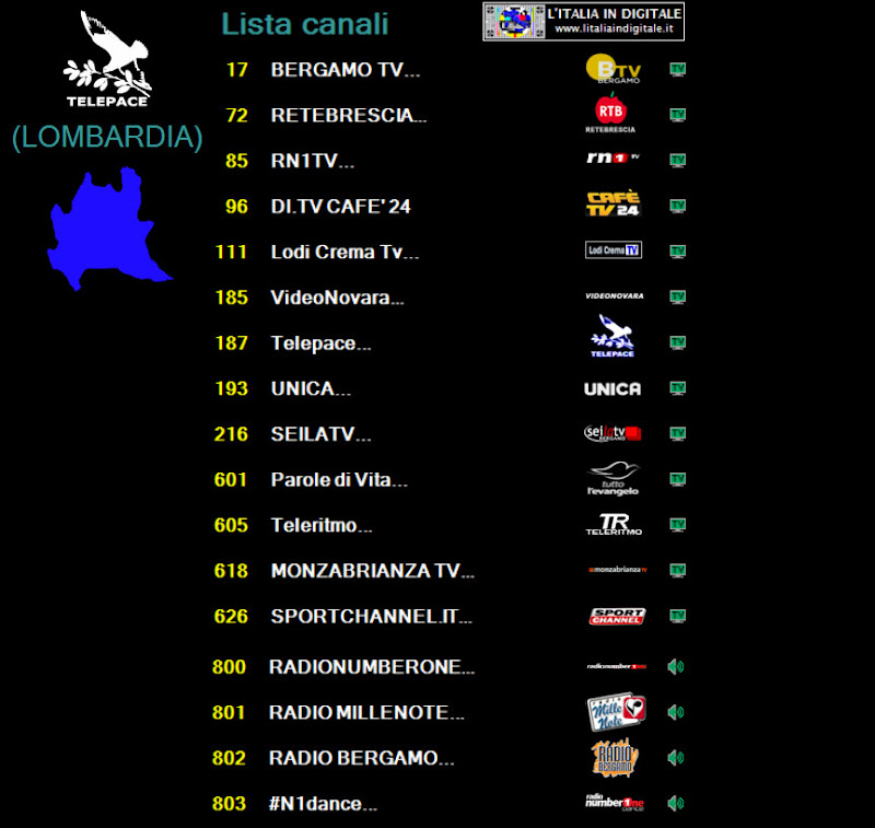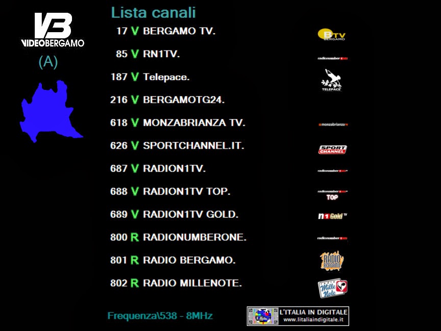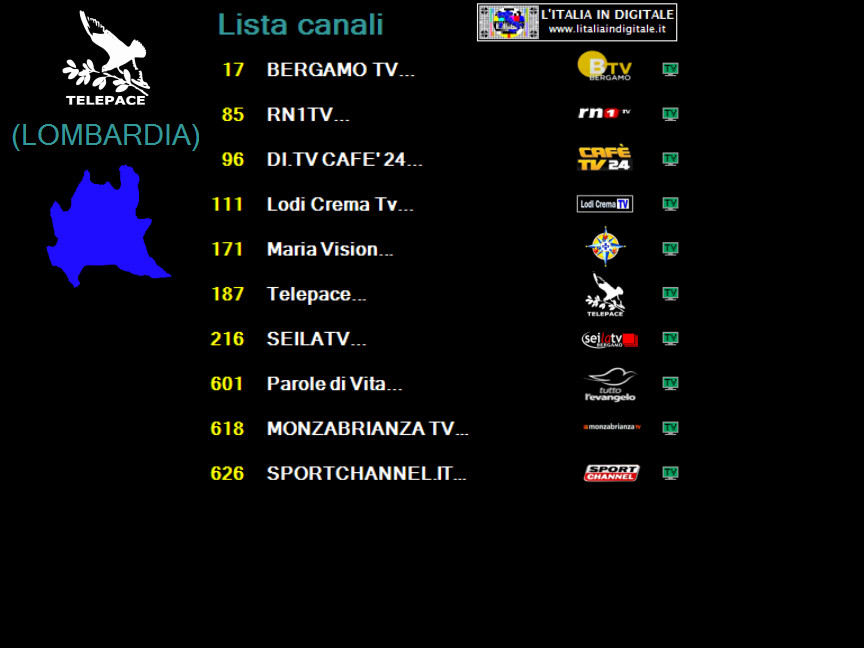 logo di stazione.Nuovo logo Vecchio logo ![]() ![]() LOMBARDIA UHF 39 Mux TELEPACE (LOMBARDIA) LCN 171 identificativo Maria Vision ![]() ![]() LAZIO UHF 42 Mux CANALE 10 LCN 670 identificativo Maria + Vision ![]() ![]() EMILIA-ROMAGNA VHF 05-06 Mux DI.TV (EMILIA ROMAGNA) LCN 684 identificativo Maria Vision ![]() ![]() MARCHE UHF 33-42-51 Mux E'TV MARCHE ![]() ![]() Abbiamo aggiornato le griglie dei canali e gli z@pping TV dei mux TELEPACE (LOMBARDIA), CANALE 10, DI.TV (EMILIA-ROMAGNA) ed E'TV MARCHE. Ore 11.20 - NUOVO LOGO DELL'EMITTENTE BERGAMO TV. BERGAMO TV ha effettuato il cambio del proprio logo di stazione, abbandonando quello storico in uso da molti anni. Nuovo logo Vecchio logo ![]() ![]() BERGAMO TV, che ha anche attivato il formato video panoramico 16:9, è presente sulla LCN 17 in alcuni provider locali della Lombardia che elenchiamo qui sotto. In ognuno di essi la tv bergamasca viene identificata in un modo differente: UHF 32 Mux BERGAMO TV Identificato BERGAMO TV ![]() UHF 42 Mux TELETUTTO Identificato Bergamo Tv ![]() ![]() UHF 29 Mux VIDEOBERGAMO (A) Identificato BERGAMO TV. ![]() ![]() UHF 21 Mux VIDEOBERGAMO (B) Identificato BERGAMO TV... ![]() ![]() UHF 39 Mux TELEPACE (LOMBARDIA) Identificato BERGAMO TV... ![]() ![]() Abbiamo aggiornato le griglie dei canali e gli z@pping TV dei mux BERGAMO TV, TELETUTTO, VIDEOBERGAMO (A), VIDEOBERGAMO (B) e TELEPACE (LOMBARDIA). 17 NOVEMBRE 2013 - Domenica Ore 15.50 - MUX TELEPACE (LOMBARDIA): ELIMINATA MEDJIUGORIE ITALIA TV. UHF 39 Mux TELEPACE (LOMBARDIA) E' stato eliminato Medjiugorie Italia TV che da qualche tempo era a schermo nero e privo di LCN. Ricordiamo che questo canale tematico religioso è presente in Lombardia nel mux SAN PAOLO TELEVISION sull' UHF 21-32 identificato Travel Tv medjugorie 2 sulla LCN 693 e nel mux RETE 55 sull' UHF 42 identificato Medjugorie Italia TV sempre sulla LCN 693. Abbiamo aggiornato la griglia dei canali e lo z@pping TV del mux TELEPACE (LOMBARDIA). 10 NOVEMBRE 2013 - Domenica Ore 01.35 - MUX TELEPACE (LOMBARDIA): INSERITO L'IDENTIFICATIVO SU RN1TV, NUOVO LOGO PER TBNE. UHF 39 Mux TELEPACE (LOMBARDIA) E' stato aggiornato l'identificativo dell' LCN 85. Dopo la scomparsa di VIDEOBERGAMO sparisce definitivamente anche il suo id, infatti in luogo della tv bergamasca erano apparsi i programmi di Radio Number One TV, ma non era stato cambiato l'identificativo che riportava sempre la denominazione VIDEOBERGAMO. Ora il canale musicale è correttamente nominato RN1TV.. . Per ribadire ai telespettatori la nuova posizione di Radio Number One TV (disponibile in questo mux anche sulla LCN 687 denominata RADION1TV..), è presente in alto a sinistra del teleschermo il numero 85. TBN ITALIA (LCN 212) ha da qualche giorno un nuovo logo di stazione, mentre risultava nuovamente disponibile Medjugorie Italia TV, a schermo nero e priva di LCN. Abbiamo aggiornato la griglia dei canali e lo z@pping TV del mux TELEPACE (LOMBARDIA). 10 OTTOBRE 2013 - Giovedì Ore 11.15 - MUX TELEPACE (LOMBARDIA): TERMINA LA PROGRAMMAZIONE DI VIDEOBERGAMO. UHF 39 Mux TELEPACE (LOMBARDIA) Nello slot identificato VIDEOBERGAMO.. (LCN 85) non è più presente la programmazione dell'emittente bergamasca ma viene ritrasmessa RADION1TV (RADIO NUMBERONE TV), già presente in questo provider alla posizione automatica numero 687. Ricordiamo che nei mesi scorsi è stato raggiunto un accordo tra VIDEOBERGAMO e BERGAMO TV (LCN 17) che prevede la messa in onda di un'unica programmazione, sotto il cappello della testata storica di BERGAMO TV, nell'ottica di ottenere le sinergie necessarie per la tutela delle specificità delle tv locali bergamasche. Per maggiori informazioni potete consultare il link che trovate di seguito. www.ecodibergamo.it/stories/Cultura%20e%20Spettacoli/390682_intesa_tra_videobergamo_e_bergamo_tv_dal_30_settembre_programmazione_unica 17 LUGLIO 2013 - Mercoledì Ore 09.25 - MUX TELEPACE (LOMBARDIA): ARRIVA MARIA VISION, ELIMINATA SHALOM TV. UHF 39 Mux TELEPACE (LOMBARDIA) Fa il suo ingresso in questo mux il canale religioso Maria Vision che si posiziona sulla LCN 171. Contestualmente, rispetto alla nostra precedente rilevazione, segnaliamo che è stata eliminata Shalom tv (in video era presente il logo Medjugorje Italia TV) che occupava la LCN 649. Abbiamo aggiornato la griglia dei canali e lo z@pping TV del mux TELEPACE (LOMBARDIA). 2 GIUGNO 2013 - Domenica Ore 15.45 - MUX TELEPACE (LOMBARDIA): ARRIVANO LODI CREMA TV E MONZABRIANZA TV. UHF 39 Mux TELEPACE (LOMBARDIA) Rispetto alla nostra precedente rilevazione segnaliamo che sull' LCN 111 è stata aggiunta Lodi Crema Tv, mentre non è più presente sull' LCN 171 DI.TV - Space TV. Inoltre nella posizione LCN 618 è stata inserita MONZABRIANZA TV.. e a sua volta è stato eliminato dalla posizione LCN 626 SPORTCHANNEL.IT... Infine segnaliamo che su TBN ITALIA (LCN 212), mentre effettuavamo la rilevazione, era presente anche il logo di TCI Televisione Cristiana Italiana. Abbiamo aggiornato la griglia dei canali e lo z@pping TV del mux TELEPACE (LOMBARDIA). 28 APRILE 2013 - Domenica Ore 01.50 - MUX TELEPACE (LOMBARDIA): ARRIVA TBN ITALIA. UHF 39 Mux TELEPACE (LOMBARDIA) E' stato inserito in questo mux il canale religioso TBN ITALIA (LCN 212). L'emittente varesina è trasmessa in Lombardia anche dal mux SAN PAOLO TELEVISION (UHF 21 - 32) con l'identificativo TBNE ITALIA sempre sull' LCN 212. Abbiamo aggiornato la griglia dei canali e lo z@pping tv del mux TELEPACE (LOMBARDIA). 15 FEBBRAIO 2013 - Venerdì Ore 11.45 - MUX TELEPACE (LOMBARDIA): ARRIVA BERGAMO TV. UHF 39 Mux TELEPACE (LOMBARDIA) Ha fatto il suo ingresso BERGAMO TV (LCN 17), al nome dell'emittente in epg sono stati aggiunti due puntini BERGAMO TV.., operazione che serve per distinguere il multiplex da cui è diffuso il canale. Anche VIDEOBERGAMO (LCN 85) e SPORTCHANNEL.IT (LCN 626) aggiungono i due puntini al nominativo, mentre RADIONUMBERONETV è ora identificata come RADION1TV.. (LCN 687). Eliminati ENTIeCOMUNITV (LCN 698)