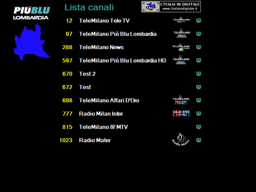 Ore 20.15 - MUX PIU' BLU LOMBARDIA: ELIMINATI ALCUNI DOPPIONI DEI CANALI, AGGIORNATA LA GRIGLIA E LO Z@PPING TV. UHF 43 Mux PIU' BLU LOMBARDIA Di seguito aggiorniamo la composizione del mux PIU' BLU LOMBARDIA che, rispetto alla nostra precedente rilevazione, ha rimosso i canali doppi privi di numerazione automatica. ![]() Attuale configurazione Sulla LCN 288 TeleMilano City, che già trasmetteva da alcune settimane la programmazione di TeleMilano News, è stato rinominato con il corretto identificativo TeleMilano News. ![]() Sulle LCN 670 e 672 sono stati aggiunti rispettivamente Test 2 e Test che attualmente sono a schermo nero. Milan Inter TV (LCN 698) è ora identificata TeleMilano Affari D'Oro. Il logo di rete è sempre quello di TeleMilano MILAN INTER RADIO TV. ![]() Sulla LCN 815 è stata aggiunta TeleMilano 8FMTV, attualmente a schermo nero. Al numero 777 Radio Milan Inter (che si inserisce nei canali TV) è sempre a schermo nero e senza audio. ![]() Infine Radio Mater non è più inserita tra le emittenti radiofoniche, aggiunge anche i parametri video pertanto si sintonizza come canale TV nell'inedita numerazione LCN 1023. Attualmente risulta a schermo nero e priva di audio. ![]()