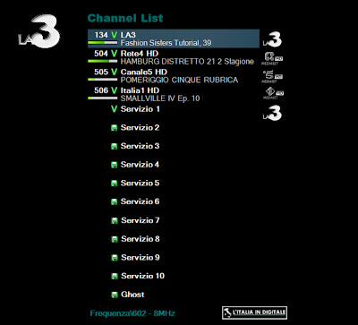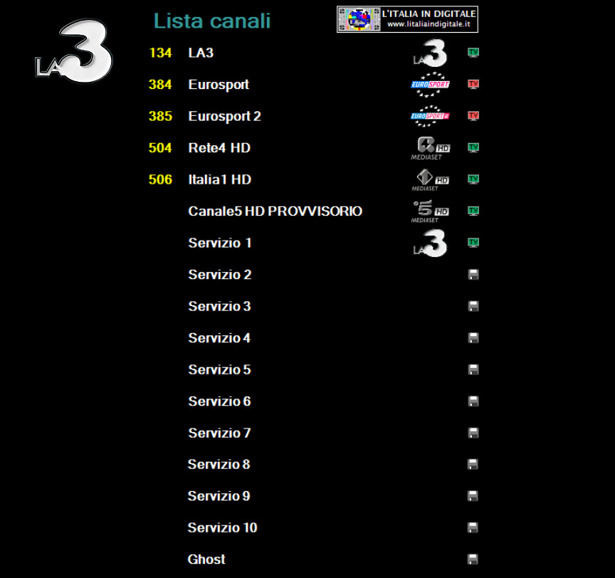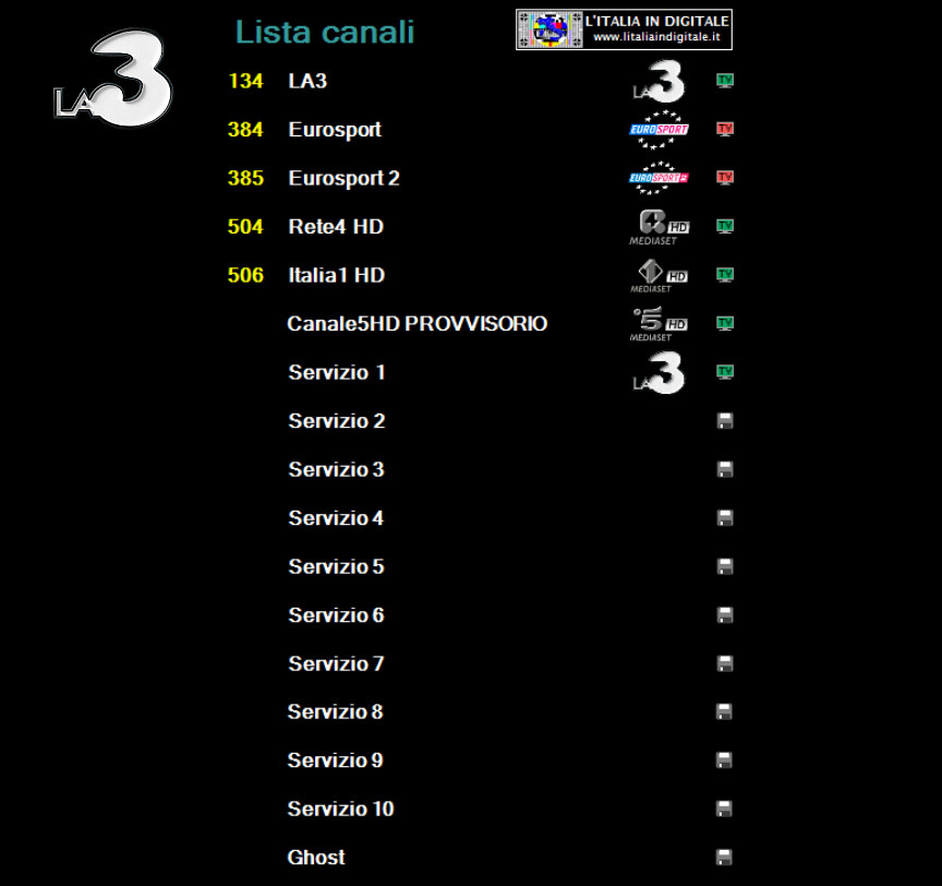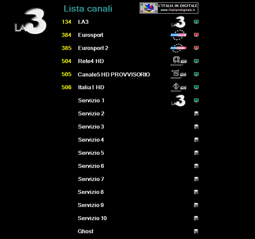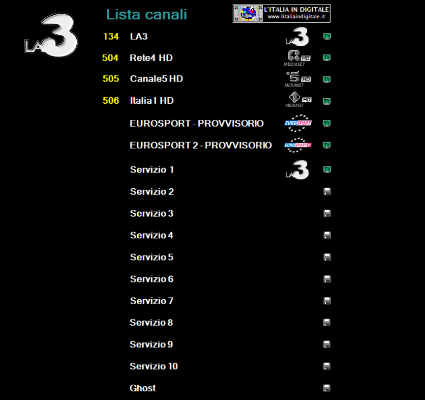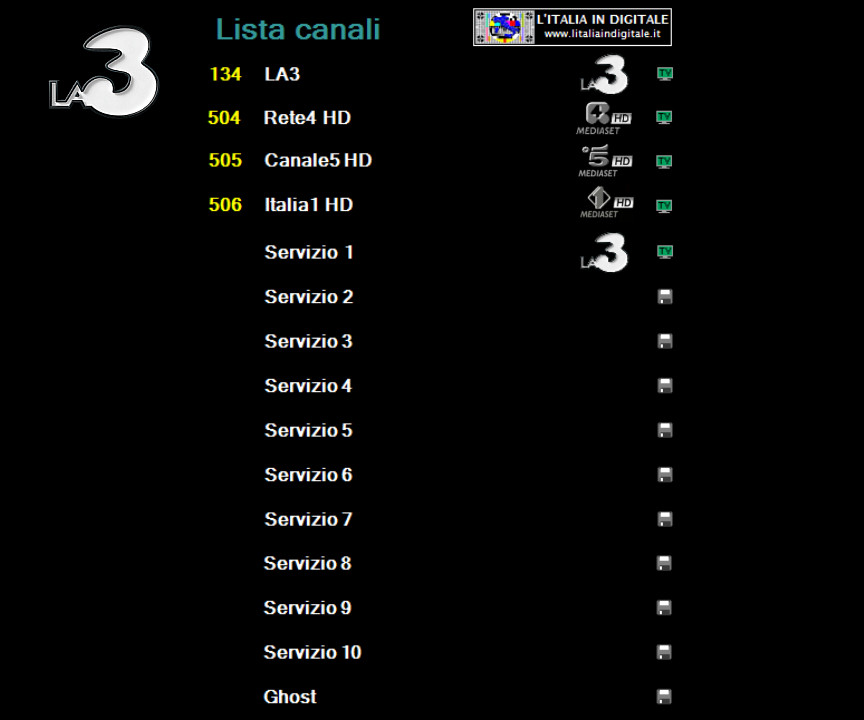 il primo nominato Servizio 1 trasmette LA3 e gli altri nove sono a schermo nero. Dalle informazioni che ci state inviando, al momento i canali sono