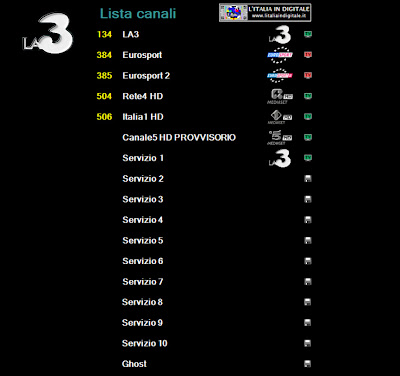 Ore 19.20 - MUX LA 3: ELIMINATA LA3. UHF 22-37 Mux LA 3 E' stato eliminato il canale LA3 dalla numerazione LCN 134, pertanto cessa le trasmissioni sul digitale terrestre, abbandonando il multiplex di proprietà. LA3 ora rimane visibile sul satellite nella piattafoma sky alla posizione 163 e online sul sito internet www.la3tv.it. Abbiamo aggiornato la griglia dei canali e lo z@pping TV del mux LA 3. ![]()