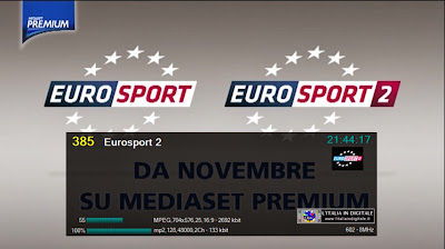 Ore 23.55 - MUX LA 3: ELIMINATI I DUE CANALI EUROSPORT PROVVISORI. UHF 22-37 Mux LA 3 Sono stati definitivamente eliminati da questo multiplex i due canali EUROSPORT - PROVVISORIO ed EUROSPORT 2 - PROVVISSORIO, entrambi erano senza numerazione LCN e trasmettevano il cartello fisso di cambio frequenza. Ricordiamo che Eurosport (LCN 384) ed Eurosport 2 (LCN 385) sono visibili solo su MEDIASET Mux 3. Abbiamo aggiornato la griglia dei canali e lo z@pping TV del mux LA 3. ![]()