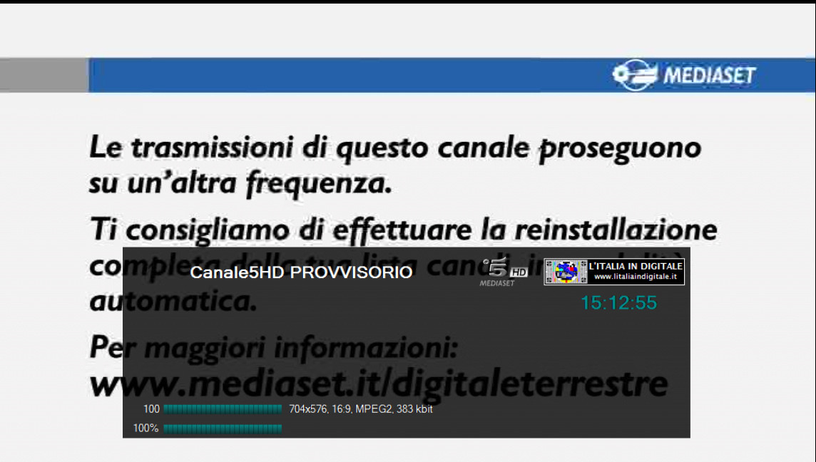 Ore 18.30 - MUX LA 3: INSERITA LA LCN 505 SU CANALE 5 HD. UHF 22-37 Mux LA 3 E' stata inserita la numerazione LCN a Canale5 HD, arrivato questa mattina sul mux LA 3. Ora è in conflitto di posizione con la sua copia CANALE 5 HD - PROVVISORIO presente nel MEDIASET Mux 3. ![]() ![]() Ore 11.50 - MUX LA 3: ARRIVA CANALE 5 HD, CARTELLO SUI DUE EUROSPORT PROVVISORI. UHF 22-37 Mux LA 3 Ritorna nel mux LA 3 Canale5 HD, al momento si sintonizza senza alcuna numerazione, pertanto non viene memorizzata nell'abituale posizione 505 che è ancora occupata da CANALE 5 HD - PROVVISORIO presente nel MEDIASET Mux 3. Inoltre ai due canali di Eurosport (EUROSPORT - PROVVISORIO, che era visibile sulla LCN 383, ed EUROSPORT 2 - PROVVISSORIO, che era sulla LCN 384) è stata rimossa la numerazione automatica e trasmettono il cartello fisso di cambio frequenza; pertanto le loro programmazioni sono visibili solo su MEDIASET Mux 3. Abbiamo aggiornato la griglia dei canali e lo z@pping TV del mux LA 3. ![]() ![]() ![]()