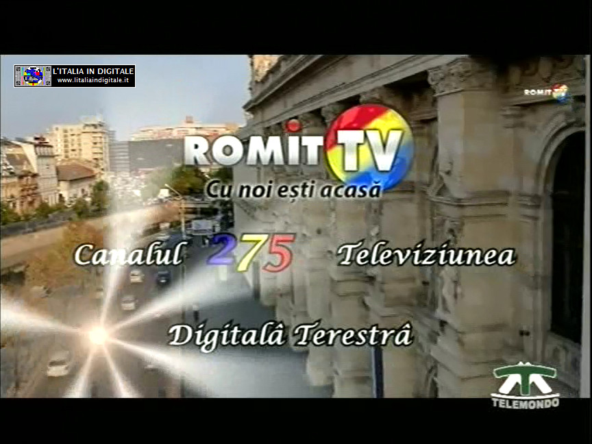 Ore 18.45 - MUX START UP COMMUNICATION: TELEMONDO AGGIUNGE ALL'IDENTIFICATIVO LA SCRITTA ROMIT TV. UHF 34-35-45 Mux START UP COMMUNICATION Nel mux pluriregionale START UP COMMUNICATION l'emittente TeleMondo (LCN 275), che da qualche giorno sta trasmettendo il loop di un promo della tv rumena ROMIT TV, ha modificato il proprio identificativo in TeleMondo ROMIT TV. Abbiamo aggiornato la griglia dei canali e lo z@pping TV del mux START UP COMMUNICATION.