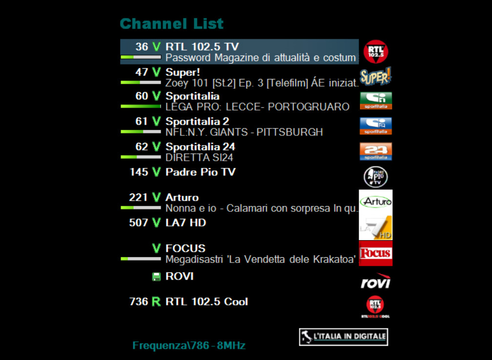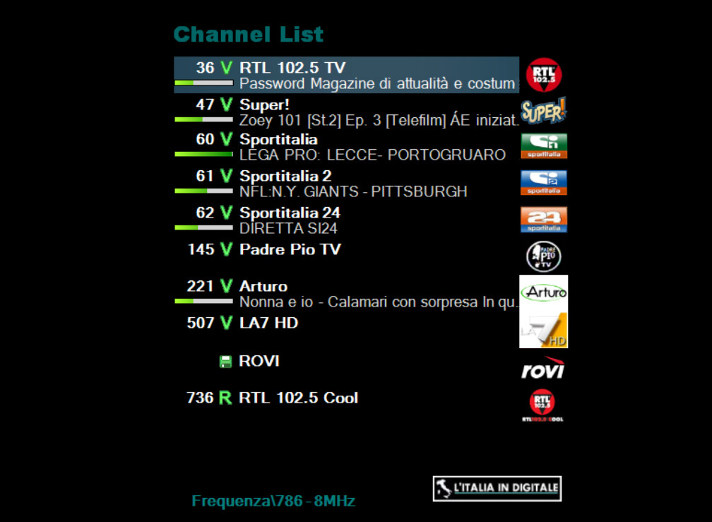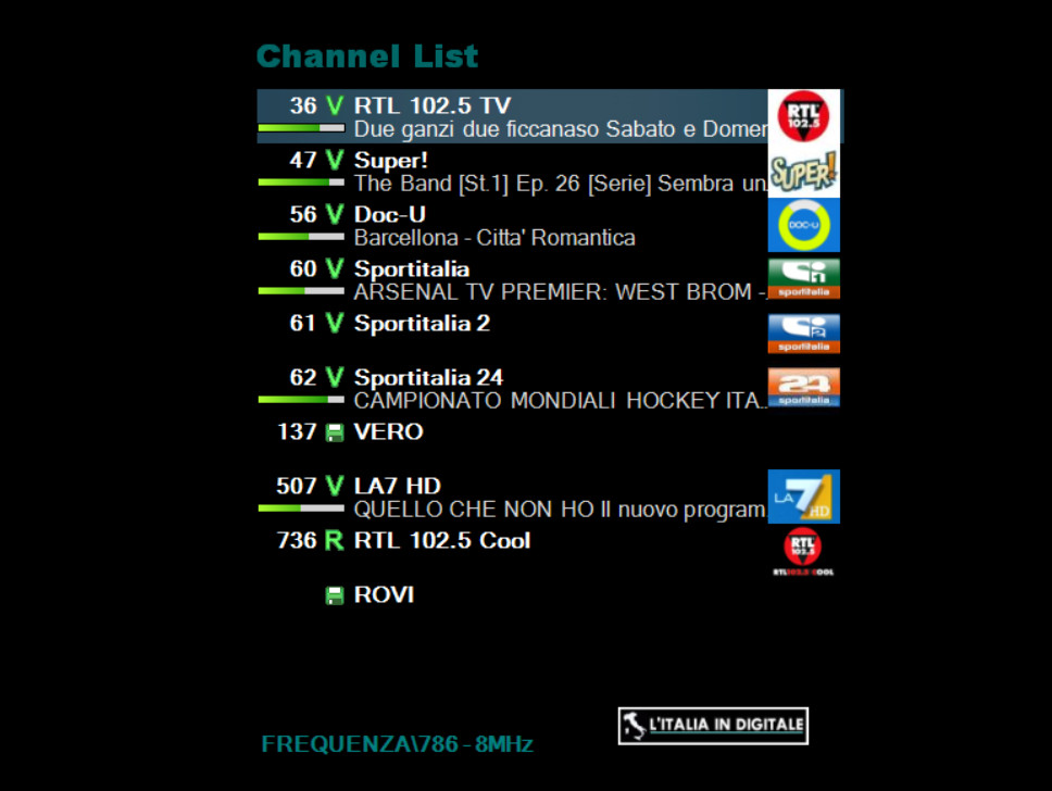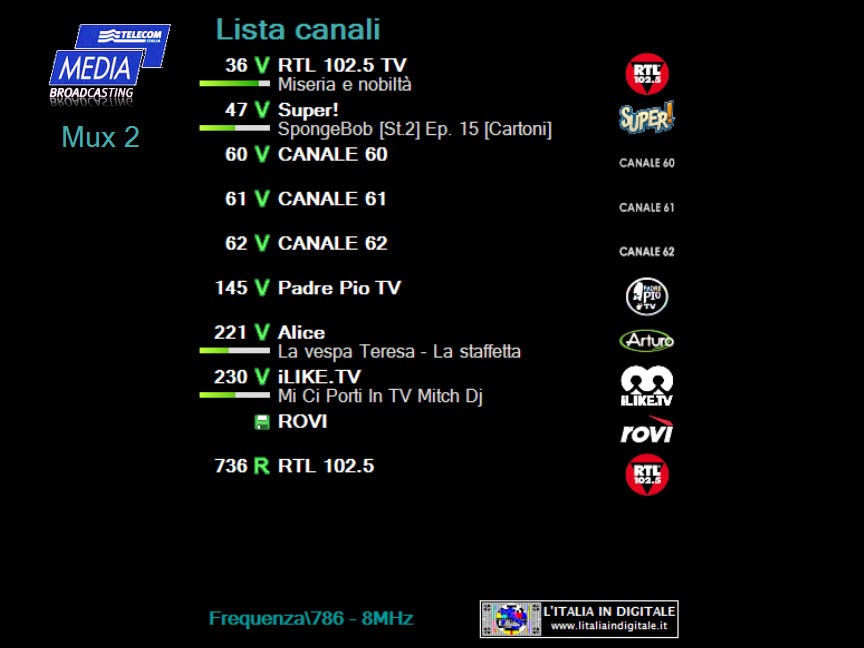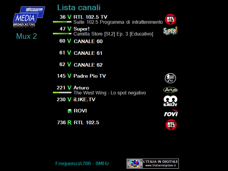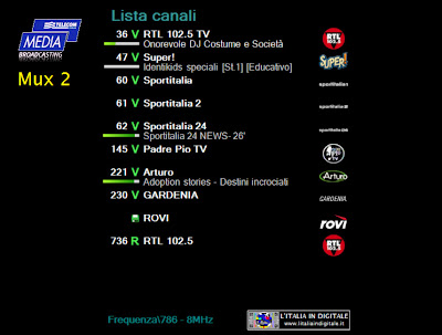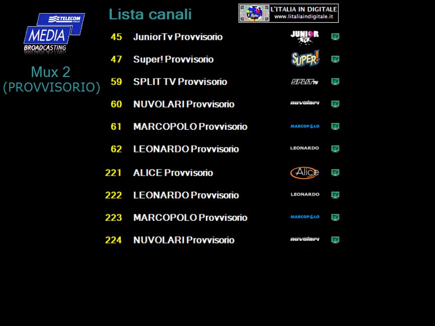 LT TELEVISIONI srl (Gruppo LT MULTIMEDIA) comunica di avere siglato un accordo di partnership editoriale e commerciale con SITCOM MEDIA srl (Gruppo Sitcom), la Società che ha rilevato da EDB MEDIA srl il ramo d'azienda relativo ai canali 60, 61, 62 del digitale terrestre, per la trasmissione sul digitale terrestre dei tre nuovi canali del GRUPPO LT MULTIMEDIA: SPORT UNO, SPORT DUE e SPORT TRE. L'accordo, nel suo complesso, permette il completamento del nuovo progetto editoriale della LT TELEVISIONI srl e, attraverso un accordo per la produzione di format e programmi originali dedicati allo sport e non solo, permette di finanziare il piano di ristrutturazione industriale avviato dalla EDB Media srl e della EDB Service srl, finalizzato a salvaguardare la continuità delle attività di produzione e loccupazione. Il progetto di riorganizzazione è stato affidato ad Orienta Partners, società specializzata in ristrutturazioni aziendali. Per poter visualizzare il corretto identificativo dei tre nuovi canali occorre una nuova risintonizzazione dei vostri ricevitori. Consulta la griglia aggiornata e lo z@pping TV del TIMB Mux 2. 25 SETTEMBRE 2013 - Mercoledì Ore 23.40 - MUX NAZIONALI - TIMB MUX 2: TERMINATE LE OPERAZIONI DEL CAMBIO DI FREQUENZA IN SICILIA. UHF 55-60 TIMB Mux 2 Oggi sono terminati i lavori dei tecnici di TIMB che hanno effettuato il cambio di frequenza del TIMB Mux 2, dall' UHF 60 all' UHF 55, dalle ultime due postazioni siciliane: PUNTA RAISI (Palermo) GIBILMANNA - Cefalù (Palermo) Nella maggiore isola italiana pertanto le trasmissioni dei canali del TIMB Mux 2, irradiate dai ripetitori del digitale terrestre, sono sintonizzabili solo sulla frequenza UHF 55. 24 SETTEMBRE 2013 - Martedì Ore 23.15 - MUX NAZIONALI - TIMB MUX 2: LE LOCALITA' SICILIANE INTERESSATE OGGI AL CAMBIO FREQUENZA. UHF 55-60 TIMB Mux 2 Oggi il cambio di frequenza del TIMB Mux 2, dall' UHF 60 all' UHF 55, ha interessato queste postazioni siciliane: SANTA MARGHERITA di BELICE (Agrigento) CASTIGLIONE di SICILIA (Catania) NICOSIA (Enna) LIMINA (Messina) 23 SETTEMBRE 2013 - Lunedì Ore 21.50 - MUX NAZIONALI - TIMB MUX 2: LE POSTAZIONI SICILIANE CHE OGGI HANNO EFFETTUATO IL CAMBIO FREQUENZA. UHF 55-60 TIMB Mux 2 Anche questa settimana continuano i lavori dei tecnici di TIMB per effettuare il cambio di frequenza del TIMB Mux 2, dall' UHF 60 all' UHF 55, nelle diverse postazioni minori siciliane. Nella giornata odierna sono stati interessati gli impianti di: CONTRADA BASTIANELLA - Canicattì (Agrigento) BELMONTE MEZZAGNO (Palermo) TORRETTA - Carini (Palermo) MONDELLO (Palermo) TERRASINI (Palermo) CONTRADA PRATO - Ragusa MONTE ARCIBESSI - Chiaramonte Gulfi (Ragusa) CONTRADA CROCEFIE - Ispica (Ragusa) MONSERRATO - Modica (Ragusa) SCICLI (Ragusa) 19 SETTEMBRE 2013 - Giovedì Ore 23.55 - MUX NAZIONALI - TIMB MUX 2: EFFETTUATO IL CAMBIO FREQUENZA A CASTELMOLA (ME). UHF 55-60 TIMB Mux 2 Questa mattina alle ore 9.00 circa è stato effettuato il cambio di frequenza, dall' UHF 60 all' UHF 55, del TIMB Mux 2, dall'impianto di CASTELMOLA in provincia di Messina. Foto: panorama di Castelmola (ME) 17 SETTEMBRE 2013 - Martedì Ore 22.20 - MUX NAZIONALI - TIMB MUX 2: LE POSTAZIONI SICILIANE CHE OGGI HANNO EFFETTUATO IL CAMBIO FREQUENZA. UHF 55-60 TIMB Mux 2 Queste le postazioni siciliane che sono state interessate nella giornata di oggi al cambio di frequenza, dall' UHF 60 all' UHF 55, del TIMB Mux 2. CONTRADA VITALLA - Caltabellotta (Agrigento) CAPO SAN MARCO - Sciacca (Agrigento) SAN GIOVANNI CASA DEL CLERO - Erice (Trapani) SANT'ANNA PIZZO ARGENTERIA - Erice (Trapani) SAN VITO LO CAPO (Trapani) 16 SETTEMBRE 2013 - Lunedì Ore 16.10 - MUX NAZIONALI - TIMB MUX 2: CAMBIO FREQUENZA EFFETTUATO A CAPO D'ORLANDO, MILAZZO E NOTO. UHF 55-60 TIMB Mux 2 Oggi il cambio di frequenza del TIMB Mux 2 (dall' UHF 60 all' UHF 55) ha interessato la provincia di Messina con le postazioni di MONTE SAN MARTINO a Capo d'Orlando e di MONTE TRINO a Milazzo, mentre in provincia di Siracusa è avvenuto dall'impianto di CONTRADA SANT'ELIA a Noto. 13 SETTEMBRE 2013 - Venerdì Ore 22.15 - MUX NAZIONALI - TIMB MUX 2: LE POSTAZIONI SICILIANE INTERESSATE OGGI AL CAMBIO FREQUENZA. UHF 55-60 TIMB Mux 2 Ecco le altre postazioni che sono state interessate nella giornata di oggi al cambio di frequenza, dall' UHF 60 all' UHF 55, del TIMB Mux 2. COZZO DI CASTRO - Altofonte (Palermo) COSTA ZITA - Marineo (Palermo) RUPE ATENEA - Agrigento POGGIO GIACHE - VILLASETA - Agrigento MONTE SAN GIULIANO - Caltanisetta MONTE SALVO - Enna CASAZZA (Messina) CAVA D'ALIGA - Scicli (Ragusa) POZZALLO (Ragusa) Ore 20.55 - MUX NAZIONALI - TIMB MUX 2: SCRITTA IN SOVRAIMPRESSIONE SU ILIKE TV. UHF 55-60 TIMB Mux 2 Sul canale iLIKE.TV, arrivato da alcune settimane sulla LCN 230 nel TIMB Mux 2, è in onda fisso in sovraimpressione la seguente frase: ilIKE.TV è finalmente in onda sul digitale terrestre canale 230. Ore 11.20 - MUX NAZIONALI - TIMB MUX 2: EFFETTUATO IL CAMBIO DI FREQUENZA A VALVERDE (CT). UHF 55-60 TIMB Mux 2 E' stato effettuato il cambio di frequenza del TIMB Mux 2 (dall' UHF 60 all' UHF 55) dalla postazione di VALVERDE in provincia di Catania. 12 SETTEMBRE 2013 - Giovedì Ore 23.15 - MUX NAZIONALI - TIMB MUX 2: EFFETTUATO IL CAMBIO DI FREQUENZA A RESUTTANO (CL) E VALGUARNERA (EN). UHF 55-60 TIMB Mux 2 Oggi il cambio di frequenza del TIMB Mux 2 (dall' UHF 60 all' UHF 55) è stato effettuato anche dall'impianto di RESUTTANO in provincia di Caltanissetta, e dalla postazione sita a VALGUARNERA CAROPEPE in provincia di Enna. Foto: panorama di Resuttano (Caltanissetta). Foto: panorama di Valguarnera Caropepe (Enna). Ore 16.00 - MUX NAZIONALI - TIMB MUX 2: EFFETTUATO IL CAMBIO DI FREQUENZA IN PROVINCIA DI PALERMO. UHF 55-60 TIMB Mux 2 E' stato effettuato nella giornata di ieri il cambio di frequenza del TIMB Mux 2 (dall' UHF 60 all' UHF 55) nelle postazioni di SANTA MARIA DEL BOSCO e SFERRACAVALLO, entrambe in provincia di Palermo. Mentre è avvenuto questa mattina dall'impianto 