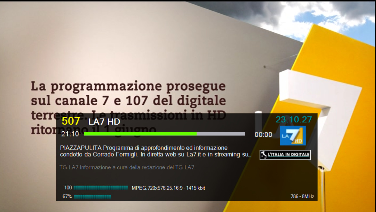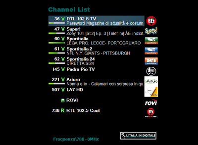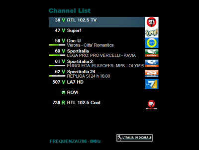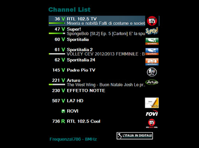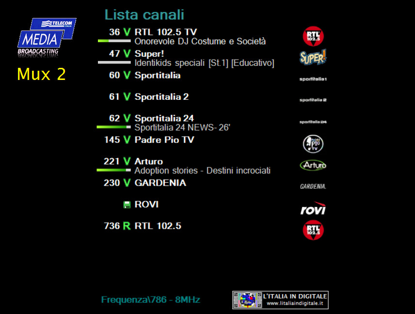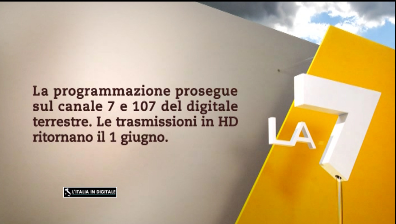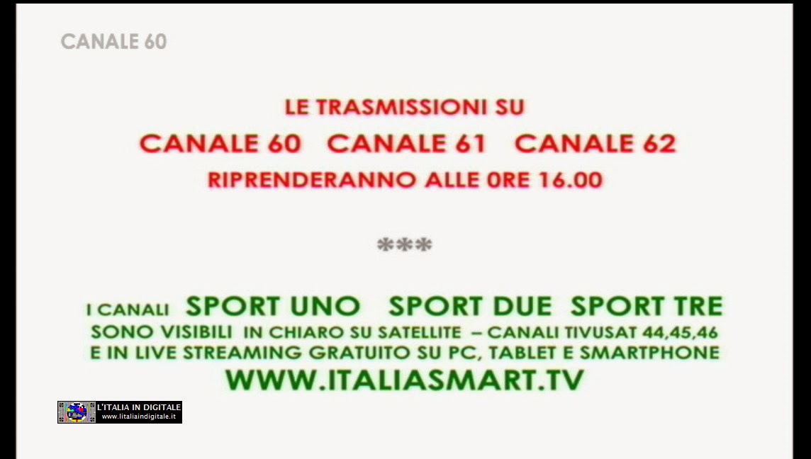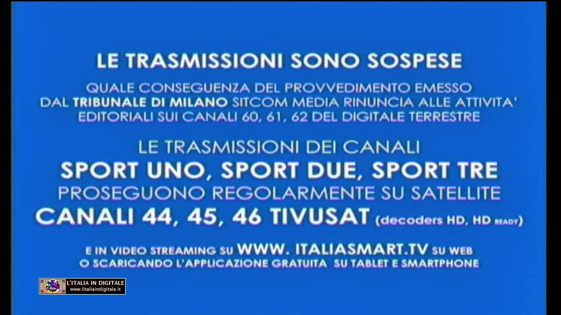 Le NEWS di TIMB Mux 2 dal 2009 al 2013 Ore 18.15 - MUX NAZIONALI - RTL 102.5 TV: PROSSIMAMENTE ARRIVERA' ANCHE SUL TIMB MUX 1. UHF 47-56 TIMB Mux 1 UHF 55-60 TIMB Mux 2 Il servizio tecnico di TIMB ci informa che prossimamente il canale musicale RTL 102.5 TV (LCN 36) verrà veicolato, oltre che sul TIMB Mux 2 dove ora è presente, anche sul TIMB Mux 1 trasmesso sulla frequenza UHF 47 e in Sardegna sull' UHF 56, con banda a 3 MHz invece degli attuali 2,5 MHz. ![]() ![]() 24 DICEMBRE 2013 - Martedì Ore 19.25 - MUX NAZIONALI - TIMB MUX 2: MODIFICATO L'IDENTIFICATIVO DI ARTURO IN ALICE. UHF 55-60 TIMB Mux 2 E' stato modificato l'identificativo in EPG del canale Arturo (LCN 221) in Alice. In onda è ancora presente la programmazione con il logo di Arturo, che terminèra le trasmissioni il prossimo 31 dicembre. Dal dal 1°gennaio 2014 subentrerà la programmazione del canale Alice. Abbiamo aggiornato la griglia dei canali e lo z@pping TV del TIMB Mux 2. ![]() ![]() 24 DICEMBRE 2013 - Martedì Ore 18.30 - MUX NAZIONALI - TIMB MUX 2: INSERITA LA SCRITTA IN VIDEO DI CANALE 60, CANALE 61 E CANALE 62. UHF 55-60 TIMB Mux 2 I tre canali che hanno preso il posto di SPORT UNO (LCN 60), SPORT DUE (LCN 61) e SPORT TRE (LCN 62), stavano trasmettendo una programmazione unificata priva di scritte o loghi in video. Ora, sintonizzandosi su questi canali che sono stati rinominati CANALE 60, CANALE 61 e CANALE 62, è presente in alto a sinistra una relativa scritta con il nome dei tre canali. ![]() ![]() ![]() La programmazione è in onda dalle ore 16.00 alle ore 24 ed è sempre unificata, mentre negli altri orari è in onda questo cartello. Abbiamo aggiornato la griglia dei canali e lo z@pping TV del TIMB Mux 2. 20 DICEMBRE 2013 - Venerdì Ore 17.25 - MUX NAZIONALI - TIMB MUX 2: SPORT UNO, SPORT DUE E SPORT TRE DIVENTANO CANALE 60, CANALE 61 E CANALE 62. UHF 55-60 TIMB Mux 2 I tre canali SPORT UNO (LCN 60), SPORT DUE (LCN 61) e SPORT TRE (LCN 62) sono stati rinominati rispettivamente CANALE 60, CANALE 61 e CANALE 63 e in onda non c'è più il cartello fisso di sospensione delle trasmissioni ma è presente una programmazione senza nessun logo di stazione, uguale per tutte e tre le posizioni LCN. Abbiamo aggiornato la griglia dei canali e lo z@pping TV del TIMB Mux 2. ![]() 19 DICEMBRE 2013 - Giovedì Ore 19.20 - MUX NAZIONALI - TIMB MUX 2: TRASMISSIONI SOSPESE PER SPORT UNO, SPORT DUE E SPORT TRE. UHF 55-60 TIMB Mux 2 Il GRUPPO LT MULTIMEDIA in conseguenza del provvedimento emesso del Tribunale di Milano in data 18 dicembre a favore della società PRS, provvedimento che preclude di fatto qualsiasi esercizio di attività editoriale sugli LCN 60, 61 e 62, comunica che con effetto immediato la Sitcom Media interrompe la trasmissione sul digitale terrestre dei canali 60, 61, 62 pertanto rinunciando ad un proprio progetto editoriale in tale ambito; constatata la reale situazione patrimoniale delle società Edb Media e Edb Service cedute dal Tribunale di Milano nell’ambito del fallimento “Marroncelli 9” (ex Interactive Group) e altresì preso atto dell’impossibilità di dare corso ad un piano di ristrutturazione delle attività e di un qualsivoglia percorso di risanamento aziendale ha conferito mandato per la finalizzazione delle azioni e procedure dirette e conseguenti. Pertanto sui canali SPORT UNO (LCN 60), SPORT DUE (LCN 61) e SPORT TRE (LCN 62) del digitale terrestre è in onda un cartello fisso che annuncia la sospensione dei programmi. Abbiamo aggiornato lo z@pping TV del TIMB Mux 2. ![]() ![]() ![]() 16 DICEMBRE 2013 - Lunedì Ore 22.25 - MUX NAZIONALI - TIMB MUX 2: AGGIUNTA LA SCRITTA NUVOLARI SU SPORT TRE. UHF 55-60 TIMB Mux 2 Sotto il logo di stazione del canale SPORT TRE (LCN 62) è stata aggiunta la scritta N U V O L A R I. Ricordiamo che dal 1°gennaio 2014 la programmazione di NUVOLARI, che abbandonerà la numerazione LCN 222 dove ora è posizionata tramite il mux TIVUITALIA, si integrerà nel palinsesto di SPORT TRE. Abbiamo aggiornato lo z@pping TV del TIMB Mux 2. ![]() ![]() ![]() 9 DICEMBRE 2013 - Lunedì Ore 15.30 - MUX NAZIONALI - TIMB MUX 2: RIMOSSA LA SCRITTA "PROGRAMMI TEST" DA SPORT UNO, SPORT DUE E SPORT TRE. UHF 55-60 TIMB Mux 2 E' stata eliminata la scritta "PROGRAMMI TEST" che era presente in sovraimpressione sotto i loghi dei tre nuovi canali sportivi del GRUPPO LT MULTIMEDIA, SPORT UNO (LCN 60), SPORT DUE (LCN 61) e SPORT TRE (LCN 62). Abbiamo aggiornato lo z@pping TV del TIMB Mux 2. ![]() ![]() ![]() ![]() ![]() 1 NOVEMBRE 2013 - Venerdì Ore 01.30 - ULTIM'ORA - MUX NAZIONALI - TIMB MUX 2: ELIMINATI I TRE CANALI DI SPORTITALIA, ARRIVANO I CANALI SPORT DELLA LT MULTIMEDIA. UHF 55-60 TIMB Mux 2 Da mezzanotte il marchio di SPORTITALIA non compare più sulle numerazioni del digitale terrestre. Sono terminati i programmi di Sportitalia (LCN 60), Sportitalia 2 (LCN 61) e Sportitalia 24 (LCN 62). Al loro posto, come era stato ampiamente annunciato, sono stati inseriti I tre nuovi canali sportivi del GRUPPO LT MULTIMEDIA di Roma SPORT UNO (LCN 60), SPORT DUE (LCN 61) e SPORT TRE (LCN 62). Sotto i rispettivi loghi di stazione, posizionati in alto a destra, è inserita la scritta PROGRAMMI TEST. Inoltre da segnalare, come si può notare dalle immagini che vi alleghiamo qui sotto, che è presente ancora l' EPG, la guida elettronica dei programmi, di Sportitalia. SPORT UNO (LCN 60) Sarà un'emittente dedicata al calcio. SPORT DUE (LCN 61) Avrà una programmazione dedicata agli sport olimpici. SPORT TRE (LCN 62) Avrà una programmazione incentrata sul mondo dei motori. Su sky invece questi canali non sono più attivi. Alla numerazione 225 di Sportitalia e 226 di Sportitalia2 è presente un messaggio generato dallo SkyBox che recita: " Dal 1 novembre il canale Sportitalia ha cessato le sue trasmissioni. Continua a seguire i grandi eventi sportivi e i programmi di approfondimento in onda sui canali Sky Sport". Dal sito della LT MULTIMEDIA: www.ltmultimedia.tv