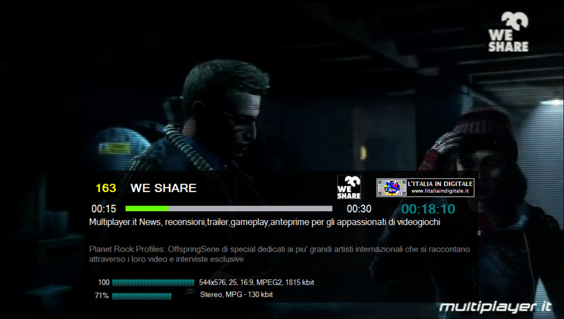 Ore 16.10 - TIMB MUX 2: SU WE SHARE E ILIKE.TV IN ONDA ENTRAMBI I LOGHI. UHF 55- 60 TIMB Mux 2 Sui canali WE SHARE (LCN 163) e iLIKE.TV (LCN 230), che trasmettono la stessa programmazione, ora si alternano in sovraimpressione, in alto a destra, entrambi i loghi di stazione e in basso non è più presente la scritta fissa "Da ottobre iLIKE.TV si rinnova e trasloca al Canale 163". ![]() ![]()