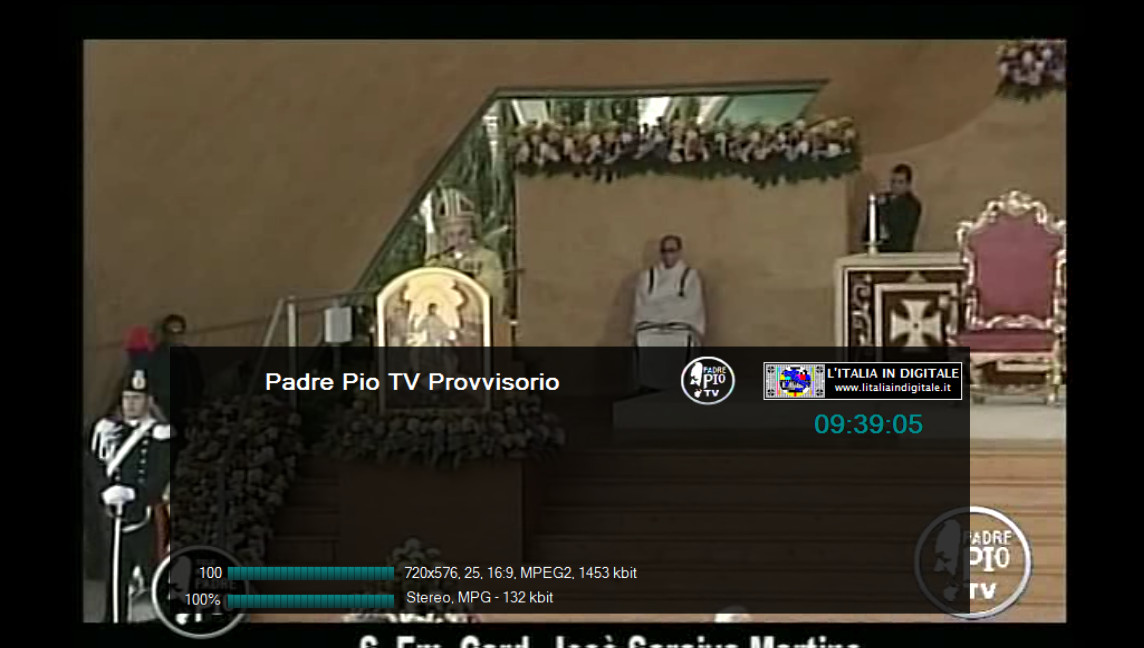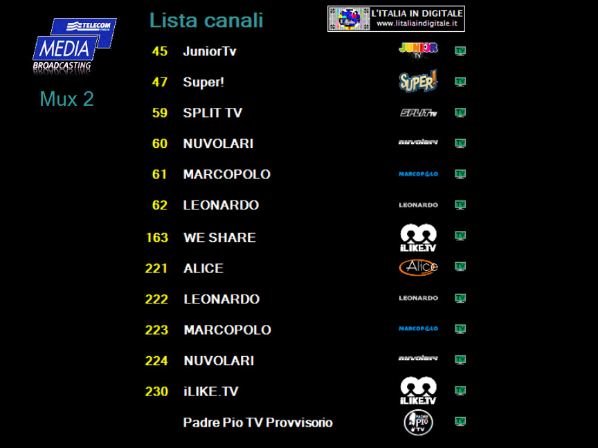 Ore 10.20 - TIMB MUX 2: PADRE PIO TV DIVENTA PROVVISORIO SENZA LCN. UHF 55- 60 TIMB Mux 2 Il canale religioso Padre Pio TV è stato rinominato in Padre Pio TV Provvisorio ed è stata eliminata la numerazione LCN 145. In giornata dovrebbe riapparire nella sua consueta posizione LCN 145 tramite RETEA Mux 2. Al momento che abbiamo effettuato le immagini Padre Pio TV stava trasmettendo con due loghi di stazione in sovraimpressione. Abbiamo aggiornato la griglia dei canali e lo z@pping TV del TIMB Mux 2. ![]()