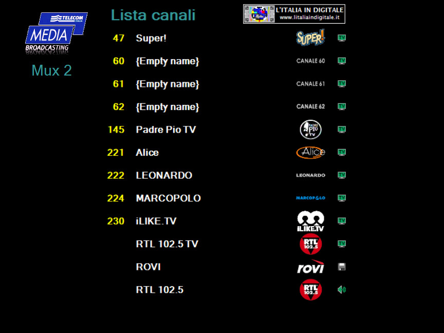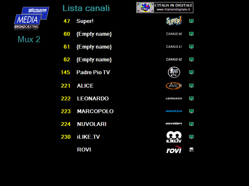 Ore 04.45 - TIMB MUX 2: ARRIVA UN DUPLICATO DI LEONARDO SULLA LCN 62. UHF 55- 60 TIMB Mux 2 Sulla numerazione LCN 62 non è più in onda la programmazione senza identificativo e senza logo ma è subentrata una copia del canale LEONARDO, già presente in questo multiplex con la LCN 222. Abbiamo aggiornato la griglia dei canali e lo z@pping TV del TIMB Mux 2 e la lista LCN NAZIONALE. ![]() ![]()
