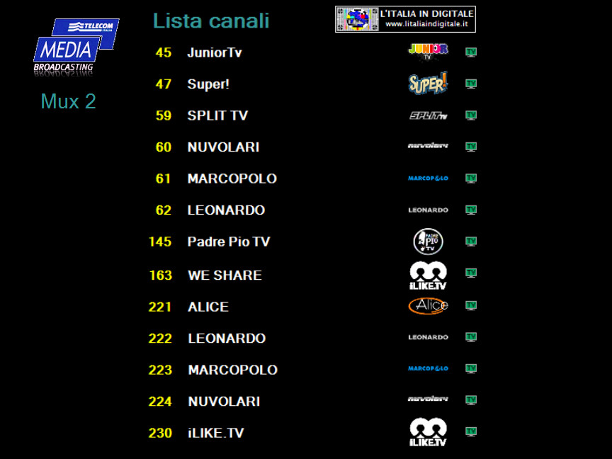 Ore 11.55 - MUX NAZIONALI - TIMB MUX 2: ARRIVA NUVOLARI, ELIMINATO EASY KIDS. UHF 55-60 TIMB Mux 2 E' stato aggiunto nel TIMB Mux 2 il canale dedicato ai motori NUVOLARI, che ritorna sul digitale terrestre con la numerazione LCN 224, in precedenza occupata da MARCOPOLO che ora passa alla posizione 223. Inoltre è stato modificato leggermente l'identificativo di Alice (LCN 221) che ora è scritto tutto maiuscolo ALICE. Infine vita breve per il canale EASY KIDS (LCN 238) che è stato eliminato. Con l'arrivo di NUVOLARI si completa l'offerta dei canali televisivi in chiaro sul digitale terrestre del GRUPPO LT MULTIMEDIA. Abbiamo aggiornato la griglia dei canali e lo z@pping TV del TIMB Mux 2. ![]() ![]() ![]() ![]() 8 MARZO 2014 - Sabato Ore 22.25 - MUX NAZIONALI - CAMBIO DI FREQUENZA TIMB MUX 2: LE ATTIVAZIONI IN QUESTA SETTIMANA DELL'UHF 55. UHF 55-60 TIMB Mux 2 Durante questa settimana la nuova frequenza UHF 55 del TIMB Mux 2 è stata attivata nelle seguenti postazioni che vi elenchiamo.