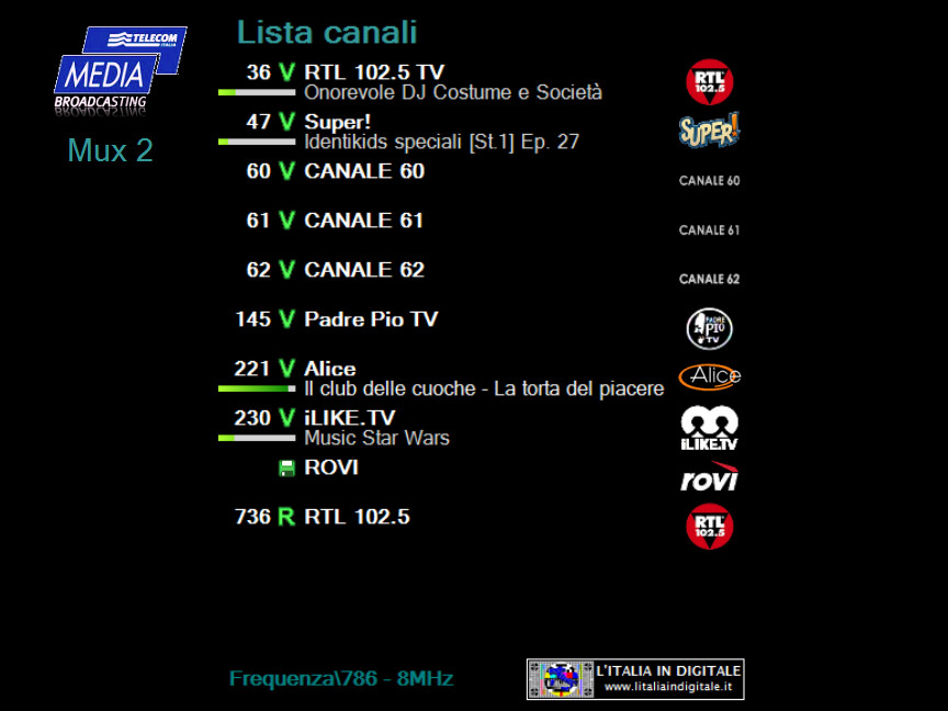 ![]() ![]() Ore 19.15 - TIMB MUX 2: ILIKE.TV PRENDE DEFINITIVAMENTE IL POSTO DI WE SHARE SULLA LCN 163. UHF 55- 60 TIMB Mux 2 Il canale iLIKE.TV si sposta definitivamente nella posizione LCN 163 sostituendo WE SHARE. Infatti la LCN 163 è stata rinominata da WE SHARE a iLIKE.TV, mentre l'identificativo della LCN 230 è stato modificato da iLIKE.TV a 230, ma continua a trasmette la programmazione di iLIKE.TV che in sovraimpressione non alterna più il proprio logo di stazione a quello di WE SHARE. Al momento della nostra rilevazione abbiamo notato che il ticker dei casting che scorre in basso risultava bloccato. Abbiamo aggiornato la griglia dei canali e lo z@pping TV del TIMB Mux 2. ![]() ![]()
