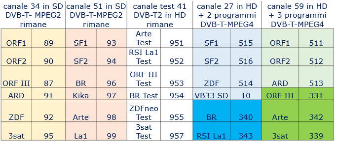 programmi della RAS sono visibili anche in qualità HD. La seguente immagine illustra le attuali composizioni dei 5 provider con le relative numerazioni. La situazione resterà inalterata fino allo switch off di Ottobre 2021, quando in Trentino-Alto Adige verranno disattivate le trasmissioni televisive sulle frequenze UHF 49-60. Contemporaneamente saranno assegnate definitivamente anche le nuove LCN. Sono stati aggiunti in definizione standard e nella modalità MPEG-4 H.264,