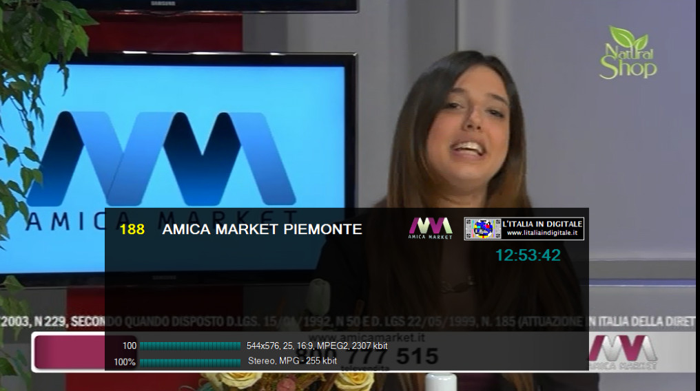 iniziati i programmi di AMICA MARKET (LCN 188). ![]() Di seguito ricapitoliamo gli identificativi e i multiplex censiti da L'ITALIA IN DIGITALE, in cui abbiamo monitorato la presenza di questo canale. Mux SESTA RETE (PIEMONTE) LCN 188 - AMICA MARKET PIEMONTE Mux RETE 55LCN 188 - Amica Marcket Lombardia Come potete vedere persiste l'errore nell'identificativo di Amica Marcket Lombardia. Mux SAN PAOLO TELEVISIONLCN 188 - AMICA MARKET LOMBARDIA