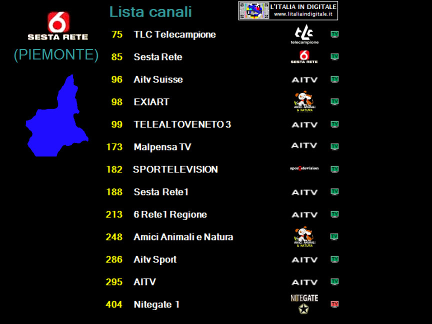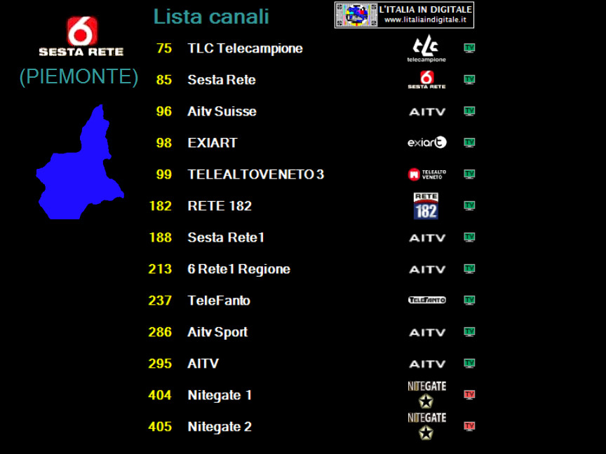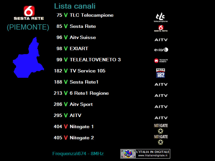 Ore 16.40 - MUX SESTA RETE (PIEMONTE): ARRIVANO CAFE TV 24 E AMICA MARKET PIEMONTE. UHF 46 Mux SESTA RETE (PIEMONTE) Nella sezione PIEMONTE IN DIGITALE potete consultare la composizione aggiornata del mux SESTA RETE che rispetto alla nostra precedente rilevazione dello scorso novembre presenta le seguenti variazioni. TLC Telecampione (LCN 75) trasmette ora la sua programmazione nel formato panoramico 16:9. ![]() Sulla LCN 96 non è più presente AITV Suisse bensì CafeTV24. ![]() Alla posizione LCN 99 di Telealtoveneto 3 non è più in onda la programmazione di AITV ma quella di Sesta Rete. ![]() Alla posizione 188, dove era presente una copia di AITV, è ora on air l'inedita AMICA MARKET PIEMONTE ed è trasmesso il loop del promo di questo nuovo canale. ![]() I due canali pay Nitegate 1 (LCN 404) e Nitegate 2 (LCN 405) sono ora veicolati come canali dati e pertanto non risultano attivi. ![]() Sulla LCN 634 il canale identificato Rete 55 non trasmette più la programmazione della tv varesina ma viene veicolata AITV. ![]() TELETIME (LCN 687) non trasmette più la sua programmazione, attualmente questa tv è sintonizzabile a schermo nero (canale dati). ![]() Segnaliamo inoltre che domenica scorsa, mentre effettuavamo una rilevazione ad ASTI, il locale impianto di AZZANO non risultava attivo. Abbiamo aggiornato la griglia dei canali e lo z@pping TV del mux SESTA RETE (PIEMONTE).