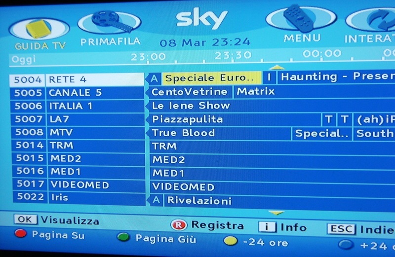 ch.05: Rai 1 ch.21: TRM ch.22: TGS ch.26: Rai 3 ch.28: TRM ch.30: Rai 2 ch.31: Teleacras ch.34: Video Regione ch.36: Mediaset 2 ch.38: Mediaset 3 ch.39: 7Gold Telerent ch.40: Rai 4 ch.42: Rete A 2 ch.43: AG TV ch.44: Rete A 1 ch.46: TVA ch.47: Timb 1 ch.48: Timb 3 ch.49: Mediaset 4 ch.50: D-Free ch.52: Mediaset 1 ch.56: Mediaset 5 ch.59: Sicilia TV ch.60: Timb 2 Ore 03.10 - CANALE ITALIA MUX 1: ATTIVATO SULL' UHF 45 DA MONTE CAMMARATA (AG). UHF 45 CANALE ITALIA Mux 1: Ore 03.05 - I MUX ATTIVATI DA MONTE CAMMARATA (AG). Ecco tutti mux attivati fino alle 3.00 dalla postazione di Monte Cammarata (Agrigento): - RAI 1-2-3-4 - MEDIASET 1-2-3-4 - TIMB 1-2-3 - RETE A mux 1-2 - Mux TGS - Mux TVA 21 GIUGNO 2012 - Giovedì Ore 17.25 - MUX TVA: ATTIVATO AD AGRIGENTO E CANICATTI' (AG). Mux TVA: E' stato attivato il mux TVA dalle postazioni di Rupe Atenea ad Agrigento e da Bastianella a Canicattì (Agrigento). Questa la composizione del multiplex: - TVA - Amica Tv - Cts TV - Video Mediterrano - M2 Mediterraneo Due - TRC Tele Radio Canicattì Ore 12.45 - MEDITERRANEO MUX 2: DA DOMANI ARRIVA CANALE 10. MEDITERRANEO Mux 2: Da domani nel MEDITERRANEO Mux 2, che trasmette dalla postazione di Monte Arcibessi (Ragusa), sarà inserito un un nuovo canale. Si tratta di CANALE 10, ed avrà la numerazone LCN 612. Ore 12.30 - MEDITERRANEO MUX 1: ARRIVA VIDEO 1. UHF 46 MEDITERRANEO Mux 1: E' stato inserito il canale Video 1, con LCN 74, ed è stato eliminato Mediterraneo2. Ore 11.45 - MUX VIDEO REGIONE: ARRIVA GOLD TV ITALIA. UHF 34 Mux VIDEO REGIONE: E' stato inserito un nuovo canale, la romana GOLD TV ITALIA. Eliminata l'emittente radiofonica Radio Mondo Centrale. 20 GIUGNO 2012 - Mercoledì Ore 23.25 - MUX TFN: ATTIVATO SULL' UHF 51 DA MONTE SAN GIULIANO (CL). UHF 51 Mux TFN: E' stato attivato il mux TFN sul canale 51 UHF dalla postazione di Monte San Giuliano (Caltanissetta). Questa la composizione del multiplex: 116 - TCS 298 - TFN 876 - TFN MC1 - TFN MC2 - TFN Test1 - TFN Test2 - TFN Test3 - TFN Test4 Ore 22.45 - MUX TVA: ATTIVATO SULL' UHF 64 DA MONTE CAMMARATA (AG). UHF 64 Mux TVA: E' stato attivato il mux TVA sul canale 64 UHF dalla postazione di Monte Cammarata (Agrigento). Questa la composizione del multiplex: - TVA - Amica Tv - Cts TV - Video Mediterrano - M2 Mediterraneo Due - TRC Tele Radio Canicattì Ore 10.40 - MUX TRM: ATTIVATO SULL' UHF 21 DA ARCIBESSI (RG). UHF 21 Mux TRM: E' stato attivato il mux TRM sul nuovo canale 21 UHF dalla postazione di Monte Arcibessi (Ragusa). Nel multiplex si sintonizzano cinque canali del Gruppo Pubblimed. 19 GIUGNO 2012 - Martedì Ore 21.30 - MUX D-NETWORK: ATTIVATO SULL' UHF 43 DA MONTE LAURO. UHF 43 Mux D-NETWORK: E' stato attivato il mux D-NETWORK sul nuovo canale 43 UHF dalla postazione di Monte Lauro (Siracusa). Ore 20.40 - MUX 7 GOLD STAMPA SUD: ATTIVATO SULL' UHF 33 DA MONTE LAURO. UHF 33 Mux 7 GOLD STAMPA SUD: E' stato attivato il mux 7 GOLD STAMPA SUD sul nuovo canale 33 UHF dalla postazione di Monte Lauro (Siracusa). Ore 03.00 - RETE A MUX 1: ATTIVATO SULL' UHF 44 DA MONTE LAURO. UHF 44 RETE A Mux 1: E' stato attivato il RETE A Mux 1 sul canale 44 UHF dalla postazione di Monte Lauro (Siracusa). Ore 02.50 - RETE A MUX 2: ATTIVATO SULL' UHF 42 DA MONTE LAURO. UHF 42 RETE A Mux 2: E' stato attivato il RETE A Mux 2 sul canale 42 UHF dalla postazione di Monte Lauro (Siracusa). Ore 02.40 - MUX ANTENNA SICILIA: ATTIVATO SULL' UHF 41 DA MONTE LAURO. UHF 41 Mux ANTENNA SICILIA: E' stato attivato il mux ANTENNA SICILIA sul nuovo canale 41 UHF dalla postazione di Monte Lauro (Siracusa). Ore 02.25 - RAI MUX 3: ATTIVATO SULL' UHF 26 DA MONTE LAURO. E' stato attivato il RAI Mux 3 sul canale 26 UHF dalla postazione di Monte Lauro (Siracusa). Ore 02.00 - RAI MUX 4: ATTIVATO SULL' UHF 40 DA MONTE LAURO. UHF 40 RAI Mux 4: E' stato attivato il RAI Mux 4 sul canale 40 UHF dalla postazione di Monte Lauro (Siracusa). Ore 01.30 - MUX TIMB 1: ATTIVATO SULL' UHF 47 DA MONTE LAURO. UHF 47 TIMB Mux 1: E' stato attivato il TIMB Mux 1 sul canale 47 UHF dalla postazione di Monte Lauro (Siracusa). Ore 01.25 - MUX VIDEO REGIONE: ATTIVATO SULL' UHF 34 DA MONTE LAURO. UHF 34 Mux VIDEO REGIONE: E' stato attivato il mux VIDEO REGIONE sul nuovo canale 34 UHF dalla postazione di Monte Lauro (Siracusa). Ore 00.05 - MUX VIDEO MEDITERRANEO: ATTIVATO SULL' UHF 46 DA MONTE LAURO. UHF 46 Mux MEDITERRANEO: Con qualche minuto di anticipo, prima della mezzanotte, è stato attivato il mux VIDEO MEDITERRANEO sul nuovo canale 46 UHF dalla postazione di Monte Lauro (Siracusa). 17 GIUGNO 2012 - Domenica Ore 22.15 - SWITCH OFF A MESSINA: AGGIORNAMENTO DEI MUX RICEVIBILI. Ecco l'aggiornamento ad oggi dei mux sintonizzabili nella città di Messina. Fonte: (Tony) Radio Tv Sicilia BANDA VHF CH. 05o – MUX 1 RAI CALABRIA CH. 10o - MUX TCF -(TELECINEFORUM) CH. 11o - MUX 1 RAI CALABRIA BANDA UHF CH. 21v - MUX TIRRENO SAT CH. 22v - MUX TGS CH. 23v – MUX TELECOLOR CH. 26v – MUX 3 RAI CH. 27v – MUX 1 RAI SICILIA CH. 29v - MUX RTP1 CH. 30v - MUX 2 RAI CH. 31v - MUX 7GOLD MUX 88 CH. 33v - MUX 7GOLD-MUX 77 CH. 36v - MUX MEDIASET 2 CH. 38v - MUX DVB-H MEDIASET 3 CH. 39v - MUX RTP2 CH. 40v - MUX 4 RAI CH. 41v - MUX ANTENNA SICILIA CH. 42v - MUX RETE A 2 CH. 44v - MUX RETE A 1 CH. 46v - MUX ONDA TV CH. 47v - MUX TIMB-1 CH. 48v - MUX TIMB-3 CH. 49v - MUX MEDIASET 4 CH. 50v - MUX D-FREE CH. 51v - MUX - TELITALIA CH. 52v - MUX MEDIASET 1 CH. 53v - MUX TREMEDIA CH. 56v - MUX MEDIASET 5 CH. 57v - MUX TELETNA CH. 60v - MUX TIMB-2 UHF 27 Mux D2 CHANNEL: Nel mux D2 CHANNEL, sul canale 27 UHF dalla postazione Belvedere a Siracusa, è stato inserito il canale TeleMarte. Inoltre è stato spento definitivamente il canale 28 UHF in analogico di TeleMarte sempre da Belvedere. Ecco la nuova composizione del multiplex: - D1 Television - D2 Channel - Teletris - Tvs - TeleMarte Fonte: (PowerVu) Radio Tv Sicilia 16 GIUGNO 2012 - Sabato Ore 16.45 - MUX TVA AGRIGENTO: NUOVE NUMERAZIONI LCN. UHF 60 Mux TVA AGRIGENTO: Sono state cambiate le