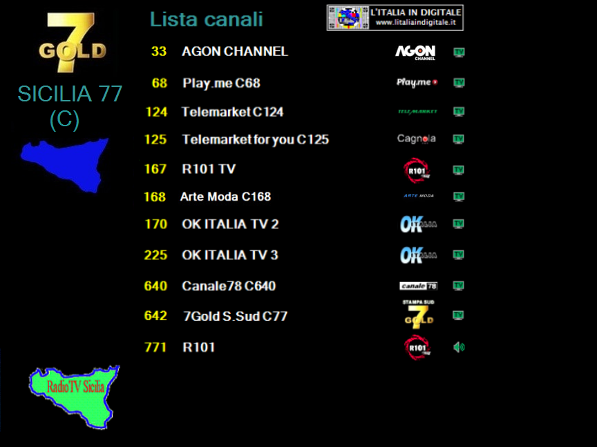 ![]() Mux 7GOLD SICILIA 77 (C) UHF 33 (570,0 Mhz)