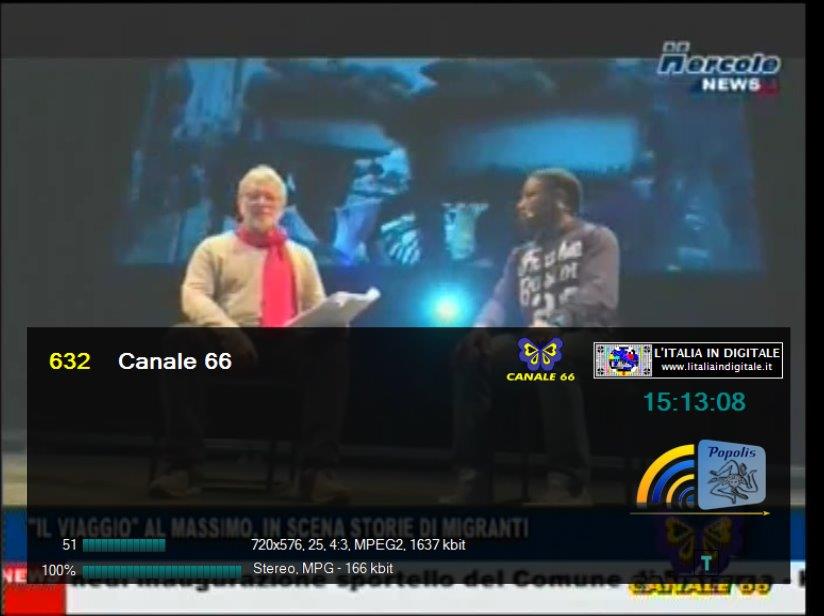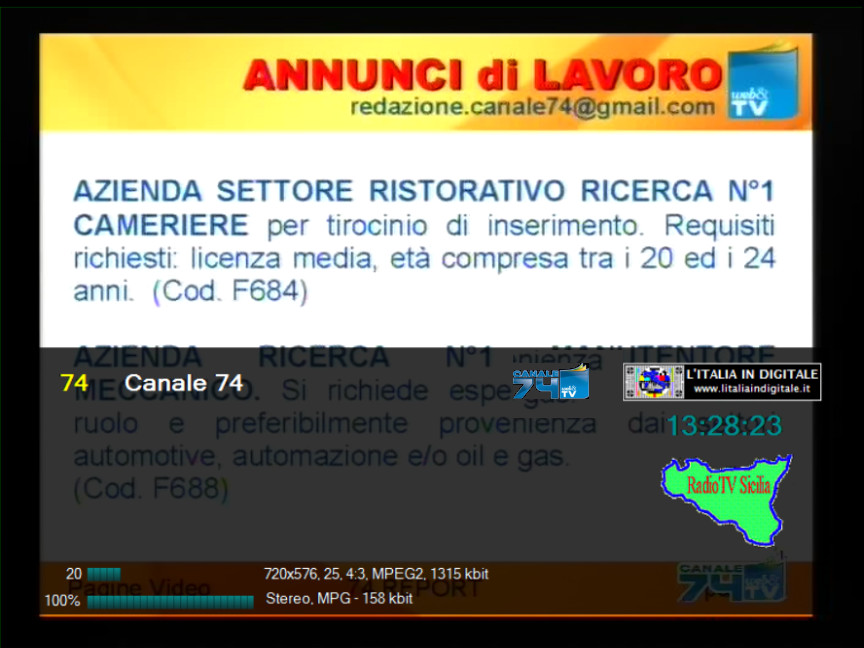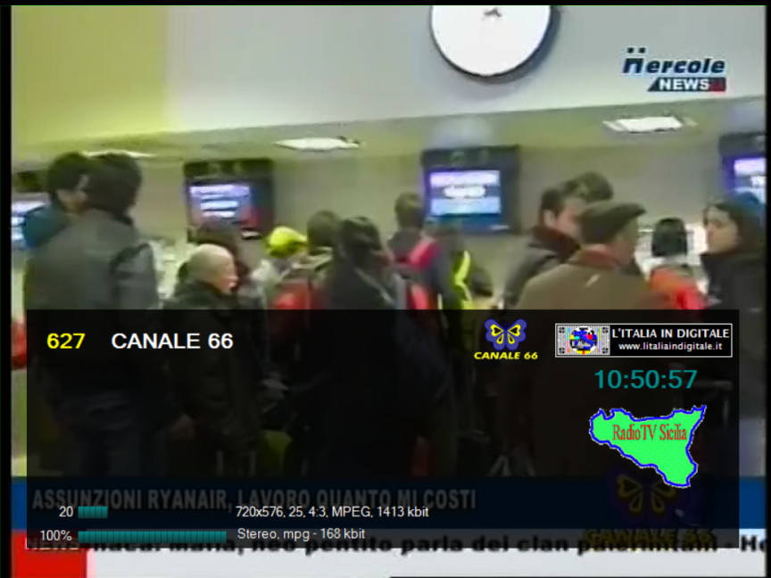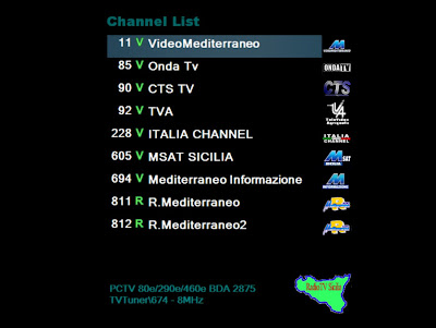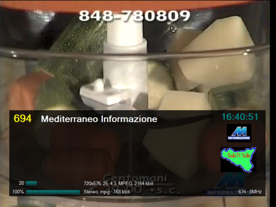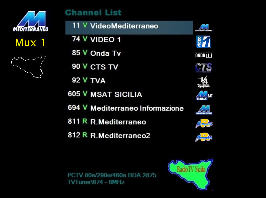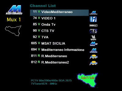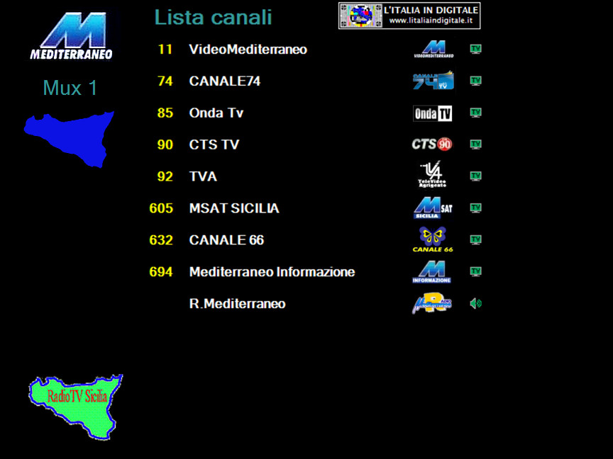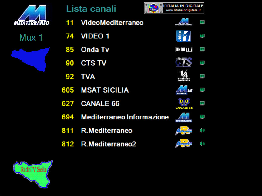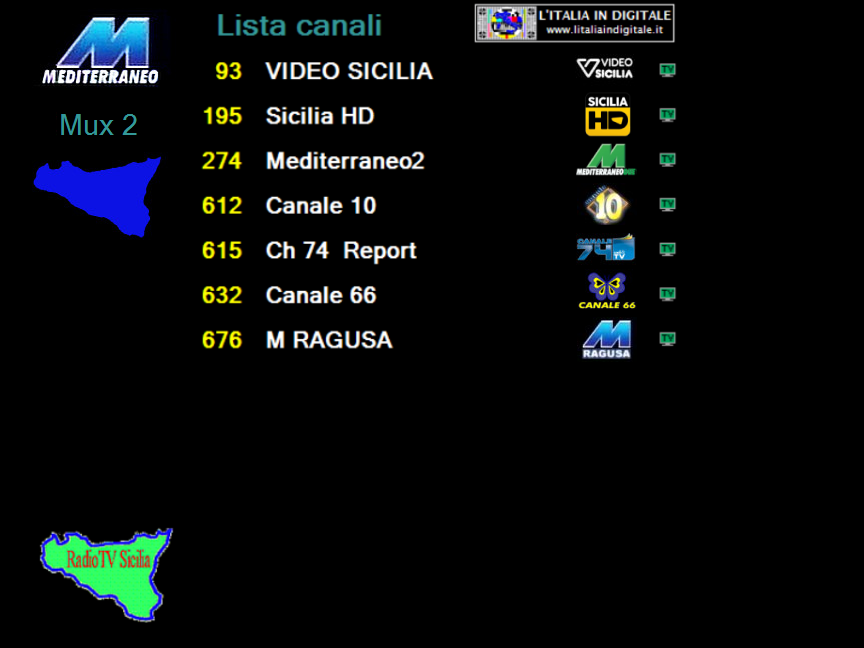 Ore 18.45 - MUX MEDITERRANEO: CANALE 66 PASSA DAL MUX 1 AL MUX 2. UHF 46 Mux MEDITERRANEO 1 / UHF 53 Mux MEDITERRANEO 2 Cambio di multiplex per l'emittente Canale 66 che dal mux MEDITERRANEO 1 passa al MEDITERRANEO 2 sempre con la numerazione LCN 632. ![]() Pertanto il mux MEDITERRANEO 1, trasmesso sulla frequenza UHF 46, veicola ora 7 emittenti TV e una radiofonica. ![]() Invece nel mux MEDITERRANEO 2, trasmesso sulla frequenza UHF 53, ora vengono veicolate 7 emittenti TV. In questo secondo multiplex segnaliamo, rispetto alla nostra ultima rilevazione, che è arrivata l'emittente Sicilia HD sulla LCN 195. In precedenza su questa numerazione era presente TELESICILIA. Sicilia HD però non trasmette in alta definizione ma in standard definition (SD). ![]() Inoltre Ch 74 Report (LCN 615) risulta a schermo nero, mentre su M RAGUSA (LCN 676) il proprio logo di rete è generato da una titolatrice. ![]() ![]()