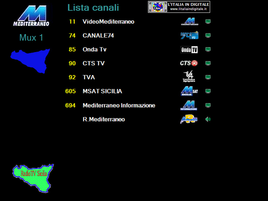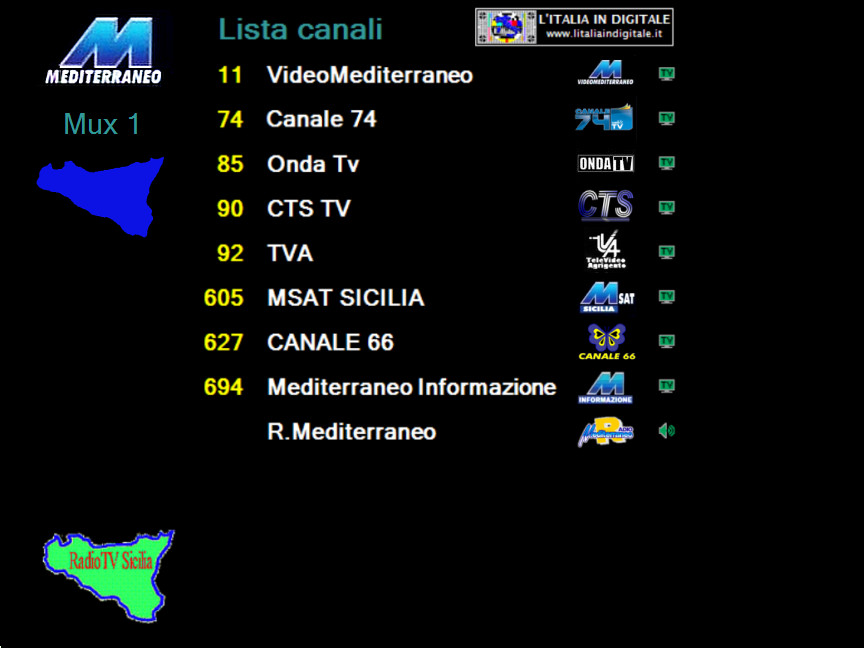 Ore 18.30 - MUX MEDITERRANEO 1: ARRIVA CANALE 74 AL POSTO DI VIDEO 1. UHF 46 Mux MEDITERRANEO 1 Dalla giornata di ieri sono iniziate le trasmissioni della nuova emittente Canale 74 che ha preso il posto di VIDEO 1 nella posizione LCN 74. Abbiamo aggiornato la griglia dei canali e lo z@pping tv del mux MEDITERRANEO 1. ![]() ![]() Ore 19.45 - MUX MEDITERRANEO 1: ARRIVA CANALE 66. UHF 46 Mux MEDITERRANEO 1 E' arrivata in questo multiplex l'emittente con sede a Caltagirone (Catania) CANALE 66, sintonizzabile con la numerazione LCN 627. Abbiamo aggiornato la griglia dei canali e lo z@pping tv del mux MEDITERRANEO 1. Qui di seguito un comunicato dell'editore: "Nuova attivazione per CANALE 66, altri 13 ripetitori si aggiungono ai 4 già in funzione per migliorare la copertura nella Regione Sicilia. Da oggi la copertura e nei capoluoghi di provincia di Catania, Ragusa, Siracusa, Enna, isola di Malta, province di Caltanissetta, Agrigento e parte di Palermo e Messina, LCN 627 frequenze mux UHF 46 - UHF 35. Ecco alcuni dei siti di emissione: Monte Lauro, Monte Arcibessi, Monte Prato Ragusa , Torre Zeta SR, Santa Croce Camerina , Scicli, Pozzallo, Testa Dell'acqua, Sant'Elia Avola, Giarratana, Cava d'Aliga, Modica Mauto, Modica Monserrato, Ispica. Buona visione su CANALE 66". ![]() ![]() 29 GIUGNO 2013 - Sabato Ore 20.05 - MUX MEDITERRANEO 1: ARRIVA VIDEO 1, ELIMINATA ITALIA CHANNEL. UHF 46 Mux MEDITERRANEO 1 E' stato inserito nel mux MEDITERRANEO 1 il canale VIDEO 1, con la numerazione LCN 74. Era già presente nel mux MEDITERRANEO 2, sempre con la LCN 74, ma ora in questo secondo multiplex diventa Video 1 Provvisorio. Ritornando al mux MEDITERRANEO 1 segnaliamo che è stata eliminata ITALIA CHANNEL che aveva la LCN 228. Abbiamo aggiornato la griglia dei canali e lo z@pping tv del mux MEDITERRANEO 1. 18 APRILE 2013 - Giovedì Ore 23.50 - MUX MEDITERRANEO 1: MEDITERRANO NEWS DIVENTA MEDITERRANO INFORMAZIONE, REALIZZATO LO Z@PPING TV. UHF 46 Mux MEDITERRANEO 1 Novità nel mux 1 dell'emittente di Ragusa MEDITERRANEO. L'emittente Mediterraneo News, con la numerazione LCN 694, cambia nome e diventa Mediterraneo Informazione. Abbiamo realizzato, oltre la griglia dei canali, anche lo z@pping TV con le emittenti trasmesse, 7 canali TV e 2 radio nel mux MEDITERRANEO 1. |
