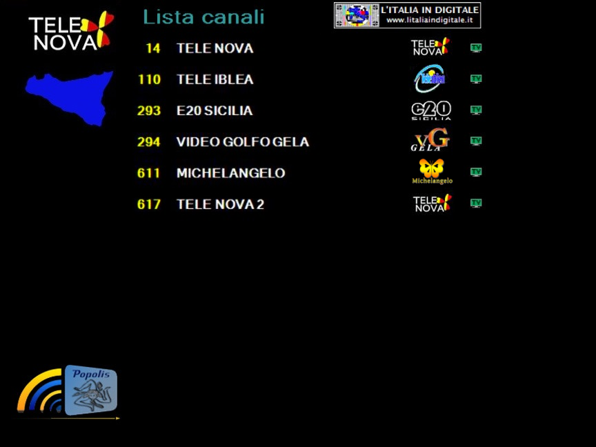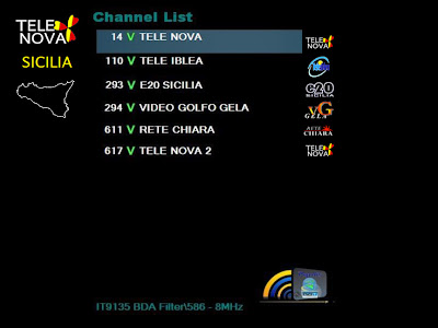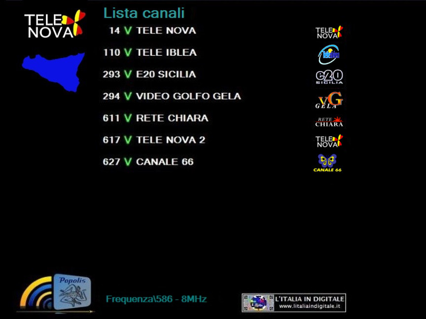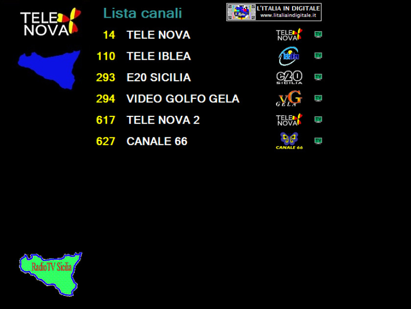 Ore 09.50 - MUX TELE NOVA SICILIA: ELIMINATA RETE CHIARA, AGGIORNATO LO Z@PPING TV. UHF 35 Mux TELE NOVA SICILIA Aggiorniamo al composizione del mux TELE NOVA SICILIA segnalando che, rispetto alla nostra ultima rilevazione, da alcune settimane è stata eliminata l'emittente RETE CHIARA che aveva la numerazione LCN 611. Abbiamo aggiornato la griglia dei canali e lo z@pping TV del mux TELE NOVA SICILIA. ![]() 19 DICEMBRE 2013 - Giovedì Ore 23.55 - MUX TELE NOVA SICILIA: ARRIVA CANALE 66. UHF 35 Mux TELE NOVA SICILIA Ritorna CANALE 66 sul digitale terrestre, da ieri è stata inserita con la numerazione LCN 627 nel mux TELE NOVA SICILIA che trasmette sull' UHF 35 dalle postazioni di Monte Prato a Ragusa e di Monte Arcibessi nel comune di Chiaramonte Gulfi (RG). Attualmente CANALE 66, la tv calatina, è visibile solamente nelle zone di coperture del mux TELE NOVA SICILIA, aggiornamenti e inserimenti in altri multiplex per la copertura della provincia di Catania saranno comunicati. Le trasmissioni proposte sono produzioni dell'emittente, film, cartoni animati e in parte della giornata trasmette il segnale della tv circuito nazionale Italian Television. Abbiamo aggiornato la griglia dei canali e lo z@pping TV del mux TELE NOVA SICILIA. ![]() ![]() ![]() ![]() ![]() ![]() 25 MAGGIO 2013 - Sabato Ore 15.50 - MUX TELE NOVA SICILIA: REALIZZATO LO Z@PPING TV. UHF 35 Mux TELE NOVA SICILIA Abbiamo realizzato lo z@pping TV con le immagini dei canali sintonizzabili nel mux TELE NOVA SICILIA, emittente di Ragusa. Il multiplex, che trasmette sulla frequenza UHF 35 dalle postazioni di Monte Prato a Ragusa e di Monte Arcibessi nel comune di Chiaramonte Gulfi (RG), è composto da sei canali: TELE NOVA (LCN 14), TELE IBLEA (LCN 110), E 20 SICILIA (LCN 293), VIDEO GOLFO GELA (LCN 294), RETE CHIARA (LCN 611) e TELE NOVA 2 (LCN 617). Consulta la pagina con la griglia dei canali, i dettagli tecnici e lo z@pping TV del mux TELE NOVA SICILIA. |