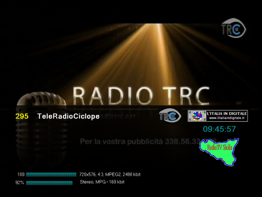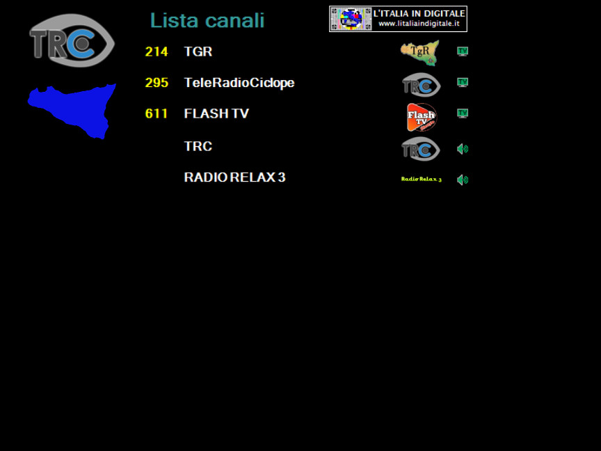 _________________________________________________________________________________________________ Le NEWS del mux TELE RADIO CICLOPE BRONTE del 2014 21 APRILE 2014 - Lunedì Ore 19.05 - MUX TELE RADIO CICLOPE BRONTE: ELIMINATE LE DUE EMITTENTI RADIOFONICHE. UHF 59 Mux TELE RADIO CICLOPE BRONTE In questo multiplex sono state elimate le emittenti radiofoniche TRC e RADIO RELAX 3 che erano prive di numerazione LCN. Abbiamo aggiornato la griglia dei canali e lo z@pping TV del mux TELE RADIO CICLOPE BRONTE. ![]() 19 APRILE 2014 - Sabato Ore 20.35 - MUX TELE RADIO CICLOPE BRONTE: ARRIVA FLASH TV LIFESTYLE, INSERITA LA GRIGLIA DEI CANALI. UHF 59 Mux TELE RADIO CICLOPE BRONTE Novità nella sezione SICILIA IN DIGITALE, da oggi è possibile consultare la griglia dei canali del mux TELE RADIO CICLOPE BRONTE dell'omonima cittadina catanese che trasmette dalla sola postazione di CONTRADA BOLO a Cesarò (Messina) sulla frequenza UHF 59. Il provider si compone di 3 TV e 2 radio. ![]() 295 - TeleRadioCiclope 611 - FLASH TV - TRC - RADIO RELAX 3 Proprio da oggi sono iniziate le trasmissioni del nuovo canale FLASH TV LIFESTYLE!, con identificativo FLASH TV, che si posiziona sulla LCN 611, emittente televisiva dell'omonima emittente radiofonica RADIO FLASH. ![]() ![]() Nella sezione SICILIA IN DIGITALE consulta la nuova pagina con la griglia dei canali e lo z@pping TV del mux TELE RADIO CICLOPE BRONTE. |