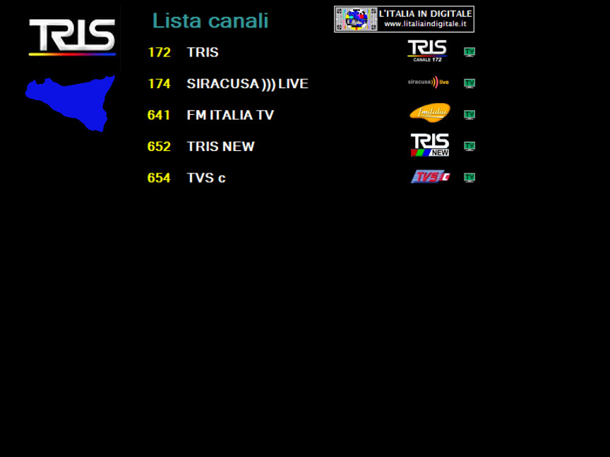 Ore 20.00 - MUX TELE TRIS: ARRIVANO SIRACUSA)))LIVE E FM ITALIA TV. UHF 59 Mux TELE TRIS Aggiorniamo la composizione del mux siracusano TELE TRIS, che trasmette sulla frequenza UHF 59 dalla postazione di VIALE ZECCHINO - TORRE ZETA a Siracusa. Sono stati inseriti due nuovi canali , SIRACUSA)))LIVE sulla numerazione LCN 174 e FM ITALIA TV che dovrebbe iniziare le trasmissioni nei prossimi giorni sulla LCN 641. Inoltre sono sintonizzabilI le tre emittenti del gruppo TELEVISIONE SIRACUSANA COLOR, TRIS (LCN 172), TRIS NEW (LCN 652) e TVS c (LCN 654). Mentre effettuavamo la rilevazione su TRIS NEW era in onda un film con il logo di Super Six, un circuito televisivo che da anni ha cessato la sua attività. Abbiamo aggiornato la griglia dei canali del mux TELE TRIS. |
