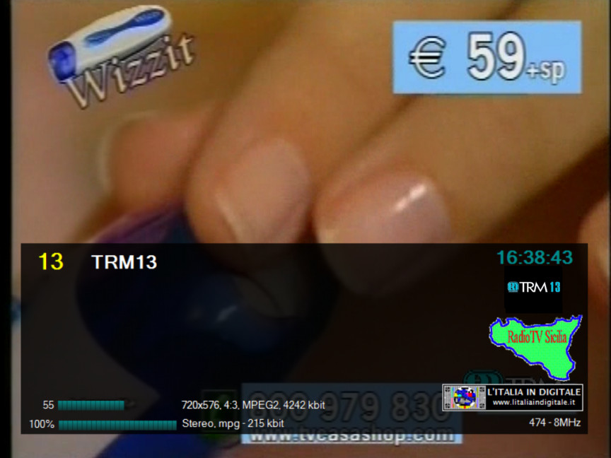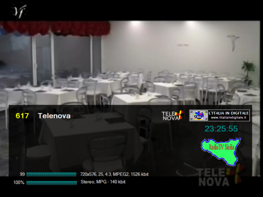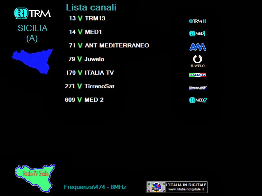 Ore 19.15 - MUX TRM SICILIA: DIVERSIFICATA LA COMPOSIZIONE DA VALVERDE (CT). UHF 21 ![]() Osservando la pagina del nostro sito riservata al relativo multiplex, questo bouquet è molto simile a quello della versione A, infatti sono presenti TRM (LCN 13), Med 1 (LCN 14), Antenna Med (LCN 71), Med 2 (LCN 609) e Telenova (LCN 617). Le uniche differenze sono la mancanza del canale a schermo nero denominato Tv (LCN 79), mentre l'emittente di Milazzo (Messina) Tirreno SAT, sintonizzabile con numerazione automatica 271, nonostante trasmetta la programmazione con il proprio logo, è identificata IL TIRRENO. ![]() ![]() ![]() ![]() ![]() ![]()