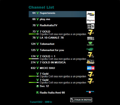 Trentino Alto Adige UHF 32 Mux TELEPADOVA (TRENTINO) Lazio UHF 32 Mux 7 GOLD LAZIO Abruzzo UHF 46 Mux ANTENNA 10 Sicilia UHF 33 Mux 7GOLD SICILIA 77 ![]()