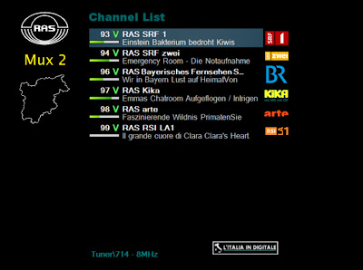 Qui sotto vi alleghiamo alcune immagini tratte dalla versione regionale veneta LA 9 (VENETO), questo è l'ultimo che abbiamo realizzato nel nostro database. Infatti ci troviamo sulla costa veneziana e nei prossimi giorni aggiorneremo le composizioni di tutti i mux locali veneti con le immagini di tutti i canali con il nostro esclusivo zapping TV. 27 LUGLIO 2013 - Sabato Ore 23.40 - MUX LA 9 (TRENTINO): AGGIORNATA LA GRIGLIA DEI CANALI E LO Z@PPING TV. UHF 43 Mux LA 9 (TRENTINO) Abbiamo aggiornato la composizione del mux LA 9 in versione regionale trentina. Rispetto alla nostra precedente rilevazione ci sono state alcune modifiche di rilievo alle denominazioni e ai canali trasmessi. Il multiplex è composto da un totale di 19 TV (di cui 7 senza LCN) e una radio (priva di LCN), per un totale di 20 canali, come potete vedere consultando la griglia dei canali che vi alleghiamo qui sotto. Sul canale La 9 (LCN 76 e su La9 priva di LCN) in alto a destra è stata aggiunta anche la scritta OUTLET CHANNEL, su La 8 (LCN 81) sempre in alto a destra è stato aggiunto il logo LA NAZIONALE, Cafe Tv 24 è presente in duplice copia, una con LCN 115 e l'altra senza LCN, mentre sulla LCN 151 arriva LA SPORTIVA che trasmette anche con il logo di La 13, presente anche con una copia senza LCN denominata La 13. ORLER CHANNEL (LCN 168) è presente con il nuovo logo (modificato un paio di settimane fa), mentre sulla LCN 169 c'è una copia di La 9 - OUTLET CHANNEL denominata in epg proprio OUTLET CHANNEL. Il canale di televendite Ok Tv è sulla LCN 170, alla posizione 232 arriva LA NAZIONALE, duplicato di La 8, inoltre è stato inserito il canale PRIMA FREE con la numerazione LCN 628, e infine c'è da segnalare che La 11 e La 12 sono prive di numerazione automatica LCN. Abbiamo aggiornato la griglia dei canali e lo z@pping TV del mux LA 9 (TRENTINO). 26 LUGLIO 203 - Venerdì Ore 17.40 - MUX RTTR: RITORNA RTT LA RADIO. UHF 45 mux RTTR In questo multiplex è stato reinserito il canale radiofonico RTT La Radio con la numerazione LCN 768. E' ancora presente il canale a schermo nero con LCN 603 senza identificativo (vedi le precedente news del 22 c.m.). Abbiamo aggiornato la griglia dei canali e lo z@pping tv del mux RTTR. 22 LUGLIO 203 - Lunedì Ore 22.10 - MUX RTTR: ARRIVA ORLER CHANNEL, VANNO VIA RTTR +1 E RTT LA RADIO. UHF 45 mux RTTR E' stato aggiunto in questo mux ORLER CHANNEL, con la numerazione LCN 168. Inoltre è stata rimossa l'emittente radiofonica RTT La Radio, che aveva la LCN 768. Contestualmente a queste modifiche è stato rimosso (per errore?) l'identificativo del canale RTTR +1, da notare che il canale senza flussi video e audio è sintonizzabile su alcuni decoder a schermo nero con la LCN 603, il nostro software lo sintonizza come TV Service 3. Sul multiplex sono comunque presenti 2.75 Mbps liberi. Abbiamo aggiornato la griglia dei canali e lo z@pping tv del mux RTTR. 19 GIUGNO 2013 - Mercoledì Ore 18.45 - AMPLIAMENTO COPERTURA RAS: I CANALI TRASMESSI DAI MUX 3 E MUX 4. UHF 27 RAS Mux 3 UHF 59 RAS Mux 4 Ultimiamo la descrizione dei mux trentini della RAS Radiotelevisione Azienda Speciale, osservando nel dettaglio i canali trasmessi dagli altri 2 flussi che completano l'offerta, ovvero il RAS Mux 3 e dal RAS Mux 4, che trasmettono in alta definizione alcuni canali presenti nel RAS Mux 1 e RAS mux 2. RAS Mux 3 514 - RAS SF 1 HD 515 - RAS SF 2 HD 516 - RAS ZDF HD RAS Mux 4 511 - RAS ORF 1 HD 512 - RAS ORF 2 HD 513 - RAS Das Erste HD Alla RAS sono state assegnate 4 frequenze. L' UHF 27 - 34 - 51 e 59. Sulla cartina gli impianti già funzionanti sono indicati con un cerchio giallo. Alcuni impianti trasmettono ancora su frequenze diverse (nella mappa sono contrassegnati con cerchi rossi ed è indicata al relativa frequenza). Il passaggio anche di questi impianti avverrà gradualmente nei prossimi anni. I cerchi grandi indicano, che da questi impianti vengono già irradiati tutti i 4 multipex della RAS. I cerchi piccoli invece indicano che i multiplex 3 e 4 sono ancora da attivare. La completa copertura è prevista entro il prossimo anno. Consulta le relative griglie con le numerazioni LCN e i loghi del RAS Mux 1, RAS mux 2, RAS Mux 3 e del RAS Mux 4. 15 GIUGNO 2013 - Sabato Ore 14.55 - AMPLIAMENTO COPERTURA RAS: I CANALI TRASMESSI DAL MUX 2. UHF 51 RAS Mux 2 Continuiamo a vedere nel dettaglio le composizioni dei mux trentini della Radiotelevisione Azienda Speciale, oggi vediamo nel dettaglio i canali trasmessi dal RAS mux 2, con i dettagli tecnici e il relativo z@pping TV. Il multiplex contiene 6 canali tv: 93 - RAS SRF 1 94 - RAS SRF zwei 96 - RAS Bayerisches Fernsehen Süd 97 - RAS Kika 98 - RAS arte 99 - RAS RSI LA1 La SRF (acronimo di Schweizer Radio und Fernsehen) è il network svizzero pubblico della Svizzera tedesca e Romancia, ed è un'azienda della SRG SSR (acronimo di Società svizzera di radiotelevisione). La SRF ha sede a Leutschenbach, un sobborgo a nord di Zurigo e al momento ha il monopolio nella copertura televisiva in tutta la Svizzera tedesca e nei territori romanci. Fino al 4 dicembre 2005 l'emittente si chiamava SF DRS: il nome era dato dall'unione di SF (Schweizer Fernsehen - Televisione Svizzera) e DRS (Deutsche und Rätoromanische Schweiz - Svizzera tedesca), RAS SRF 1 (LCN 93) www.srf.ch SRF 1 è la prima televisione svizzera pubblica di lingua tedesca e svizzero tedesca. Nata il 7 aprile 1953 rimase fino al 1997, l'unica TV pubblica di lingua tedesca (nascerà poi SF zwei). Nel 2005 vengono delineati i ruoli di entrambe le emittenti, trasformando SF1 in un canale generalista per tutte le età. Il 16 dicembre 2012 SF 1 è diventata SRF 1. RAS SRF zwei (LCN 94) www.srf.ch SRF 1 è la seconda televisione svizzera pubblica di lingua tedesca e svizzero tedesca. Nasce il 1º settembre 1997 e ripropone i programmi di SRF 1 ad orari diversi da quelli ufficiali di messa in onda; ad oggi SRF zwei, oltre a svolgere questa funzione, si offre come punto d'intrattenimento per quanto riguarda i
