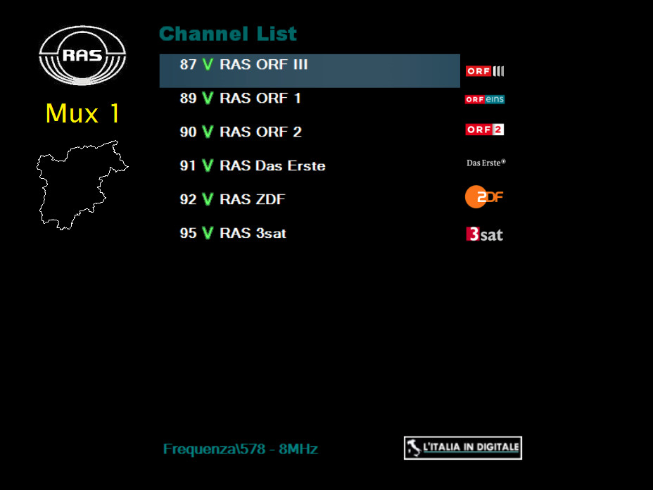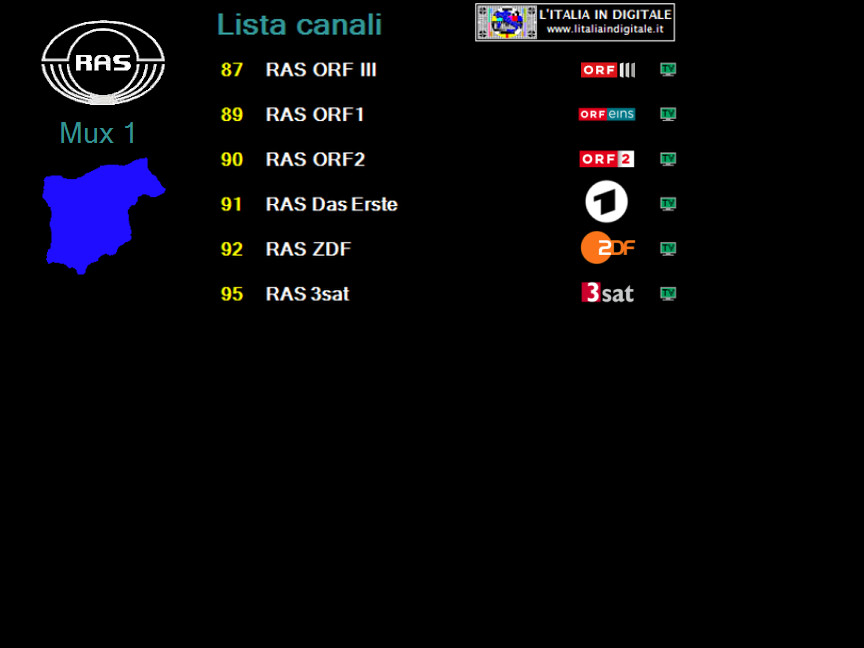 Ore 15.45 - RAS MUX 1: RINNOVATA LA GRIGLIA DEI CANALI E LO Z@PPING TV. UHF 34 RAS Mux 1 La RAS - Radiotelevisione Azienda Speciale per la provincia autonoma di Bolzano è un'azienda di servizio pubblico radiotelevisivo che ha per compito la diffusione sul territorio dell' Alto Adige dei programmi radiotelevisivi di lingua tedesca e ladina. Nelle pagine della sezione TRENTINO ALTO-ADIGE IN DIGITALE del nostro sito abbiamo rinnovato la griglia dei 6 canali TV trasmessi dal RAS Mux 1. Inoltre è possibile visualizzare attraverso lo z@pping TV i loghi di stazione utilizzati dalle emittenti insieme alle immagini che abbiamo recentemente campionato. Ricordiamo inoltre che questo provider è trasmesso nella provincia di Trento sull' UHF 34, mentre in quella di Bolzano, oltre a tale frequenza, viene talvolta utilizzato anche l' UHF 24 - 38 - 56 - 58 (trattasi per lo più di gap filler). Nella nostra griglia abbiamo elencato le principali postazioni, mentre cliccando su questo link è possibile consultare l'elenco di tutti gli impianti che veicolano in TRENTINO ALTO-ADIGE il RAS Mux 1. ![]() ![]() ![]() ![]() ![]() ![]() ![]() 14 GIUGNO 2013 - Venerdì Ore 23.30 - RAS: REALIZZATO LO Z@PPING TV DEI CANALI DEL MUX 1. UHF 34 RAS Mux 1 Dopo aver inserito la griglia dei canali del RAS Mux 1 aggiungiamo anche lo z@pping TV che vi permette di visualizzare le immagini dei canali trasmessi e i dettagli dei loghi in onda sui 6 canali TV. Ore 01.05 - LA RAS AMPLIA LA SUA COPERTURA IN TRENTINO: REALIZZATA LA GRIGLIA DEI CANALI DEL MUX 1. UHF 34 RAS Mux 1 La RAS - Radiotelevisione Azienda Speciale per la Provincia autonoma di Bolzano è un'azienda di servizio pubblico radiotelevisivo che ha per compito la diffusione sul territorio dell'Alto Adige dei programmi radiotelevisivi di lingua tedesca e ladina. Da qualche giorno la copertura dei 4 multiplex si è ampliata, il Consiglio della Provincia autonoma di Trento ha approvato una mozione per aumentare la copertura in Trentino, autorizzando RAS ad attivare il ripetitore di Cima Paganella a Terlago (Trento). L'ITALIA IN DIGITALE, grazie alla collaborazione di Gabriele di Civezzano (TN), vi mostrerà la composizione di ciascun mux della RAS, inserendo, come stiamo facendo per la sezione FRANCIA IN DIGITALE, alcuni dettagli descrittivi dei canali trasmessi. Vediamo nel dettaglio la composizione del RAS Mux 1, trasmesso sulla frequenza UHF 34, che contiene 6 canali tv: 89 - RAS ORF 1 90 - RAS ORF 2 91 - RAS Das Erste 92 - RAS ZDF 95 - RAS 3sat RAS ORF III (LCN 87) http://tv.orf.at/orfdrei RAS ORF 1 (LCN 89) http://tv.orf.at/program/orf1 RAS ORF 2 (LCN 90) http://tv.orf.at/program/orf2 L'ORF ha un ruolo predominante nei media austriaci, infatti l'Austria è stato uno degli ultimi paesi europei a permettere trasmissioni televisive private. Il monopolio dell'ORF durò fino al 2003, quando nacque il primo canale privato austriaco chiamato ATV. La ORF è stata lanciata il 30 settembre 1924 e si chiamava Radio Verkehrs AG. Nel 1938, quando l'Austria si univa alla Germania, cambiava nome in Großdeutscher Rundfunk. Dopo la fine della seconda guerra mondiale nel 1945 il Großdeutscher Rundfunk perse l'Austria e le emittenti radiofoniche si divisero in tanti diversi canali. Il 1º agosto 1955 questi canali austriaci diversi si univano in Österreichischer Rundfunk e da quel giorno nacque l'ORF e il primo canale televisivo. Nel 1961 nacque il secondo canale, ORF 2, mentre il primo gennaio 1969 iniziavano le prime trasmissioni a colori. Dal 1969 al 1974 ci fu la transizione dei programmi dal bianco e nero al colore che fu completata il 17 gennaio 1975. Sempre dal 1975 iniziano i programmi su scala locale delle 9 regioni austriache, con i notiziari che vanno in onda dalle ore 19:00 alle 19:20. Nel 1980 cominciano le prime prove del televideo austriaco, mentre nel 2006 l'ORF inizia la sperimentazione del digitale terrestre; la transizione termino' definitivamente in tutta l'Austria il 7 giugno 2011. Il 10 aprile 2007 ci fu il passaggio al formato panoramico 16:9, mentre Il 26 ottobre 2011 prese il via il canale ORF III che trasmette programmi di cultura e informazione. L'emittente tedesca Das Erste (letteralmente "La Prima") che fa capo ad ARD, è la più importante rete generalista televisiva pubblica tedesca. Una curiosità: per questo canale esiste una rigida legislazione riguardo alla pubblicità che non può essere trasmessa dopo le ore 20 e non può interrompere le trasmissioni a parte (ad esempio) nella pausa tra i due tempi delle partite di calcio; inoltre la domenica non si possono trasmettere spot e comunque non possono essere diffusi più di 20 minuti totali di pubblicità al giorno. RAS ZDF (LCN 92) www.zdf.de L'emittente tedesca ZDF, Zweites Deutsches Fernsehen (letteralmente "Seconda Televisione Tedesca"), è una televisione pubblica finanziata dal canone e dalla pubblicità. L'emittente iniziò le trasmissioni il 1º aprile del 1963. Il canale trasmise il suo primo programma a colori nel 1967. Prima della riunificazione della Germania, ZDF, così come ARD, posizionarono buona parte dei loro ripetitori in località che permettessero la copertura di buona parte della Germania dell'Est, dove i canali erano visti, sia pure illegalmente, da buona parte della popolazione locale. Dal 2002 iniziano le sperimentazioni delle trasmissioni in digitale terrestre in molte zone della Germania. ZDF gestisce anche i canali KI.KA, arte, 3sat e Phoenix, ZDFneo (in passato ZDFdokukanal), ZDFinfo e ZDFtheaterkanal. Oggi la ZDF è il più grande network televisivo europeo e viene distribuito anche in Svizzera e Austria. RAS 3sat (LCN 95) www.3sat.de la tv tedesca 3sat è un canale televisivo pubblico generalista senza interruzioni pubblicitarie, appartenente alle aziende televisive tedesche ZDF e ARD, all'austriaca ORF e alla svizzera SRG SSR. 3sat nacque nel 1984 grazie all'accordo di collaborazione di 3 grandi aziende televisive, Zweites Deutsches Fernsehen, Österreichischer Rundf